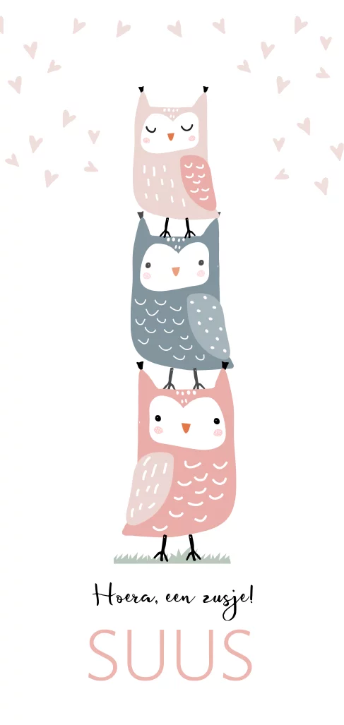 Een rustig dieren geboortekaartje voor een meisje, een derde kindje. Drie lieve uiltjes staan boven op elkaar, wat een leuk effect geeft. Op dit babykaartje Suus staan de drie kindjes (een baby zusje, een broer en een grote zus) in de vorm van uiltjes in zalm roze en blauwe tinten. Het kleinste uiltje heeft de oogjes dicht. Rondom de uiltjes staan kleine hartjes.