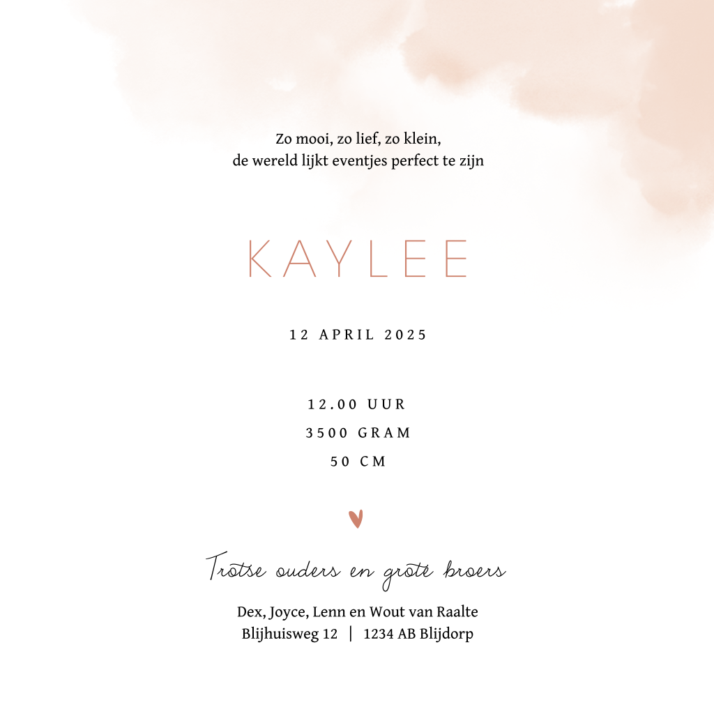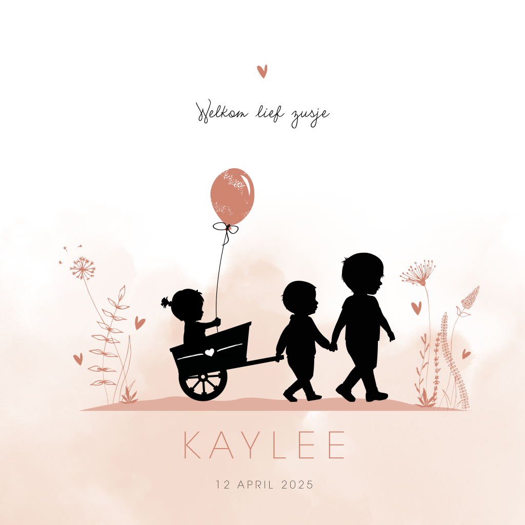 Silhouet geboortekaartje voor een derde kindje, een dochter. Op dit baby kaartje met de naam Kaylee staan twee grote broers samen met hun kleine baby zusje. Het kleine meisje zit in een karretje met een ballon in haar hand. Verder op dit kaartje een roze aquarel achtergrond, mooie veldbloemen en kleine hartjes in trendy terra kleur. Dit silhouet kaartje voor een derde kind is gemakkelijk aan te passen en ook mogelijk in een andere gezinssamenstelling.