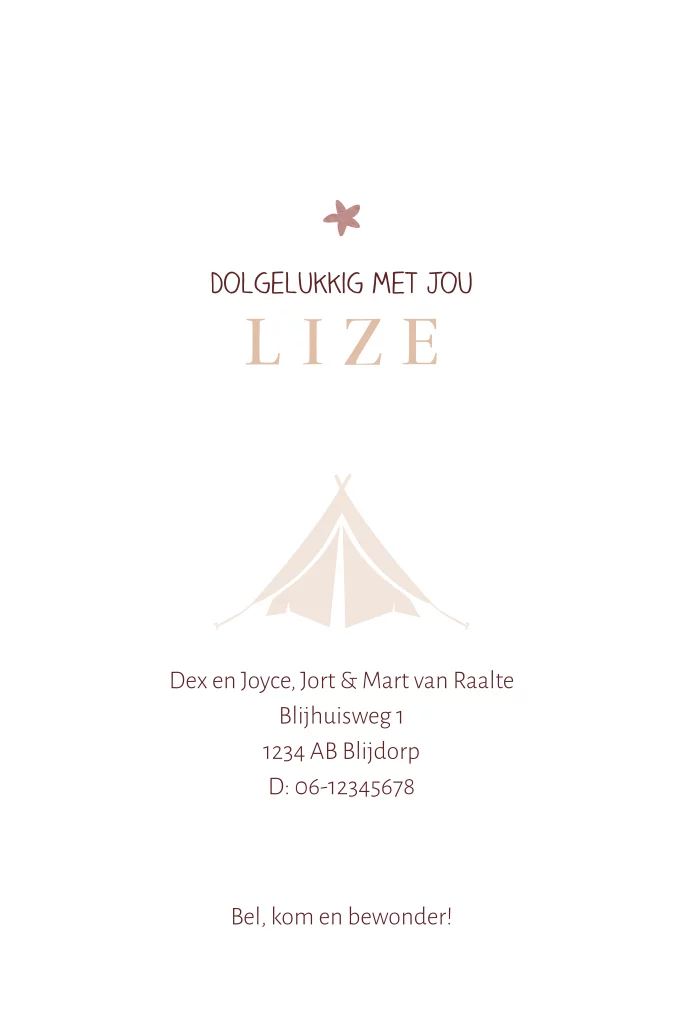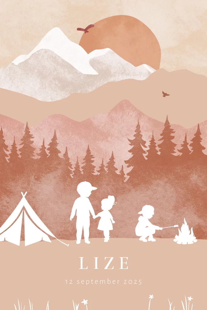Silhouet geboortekaartje voor een zusje. Op dit meisjeskaartje Lize twee broertjes die samen met hun kleine zusje in de bergen aan het kamperen zijn. Eén van de jongens warmt een worstje op bij het kampvuur, de andere broer staat hand in hand met zijn zusje naast een tent. Op de achtergrond een ondergaande zon. Liever andere teksten en lettertypes? Dit pas je eenvoudig aan in de editor. Ook mogelijk met een ander silhouet of voor een andere gezinssamenstelling.