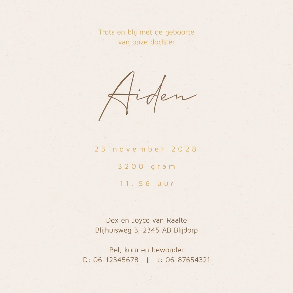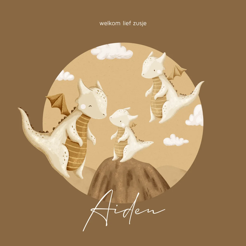 Geboortekaartje voor een meisje, een zusje. Dit geboortekaartje Aiden is voorzien van een illustratie van draakjes, een grote zus en grote broer, tussen de wolken. Het kleine babydraakje staat op een rots. Dit geboortekaartje heeft neutrale kleuren. De teksten en kleuren kun je aanpassen in de editor.