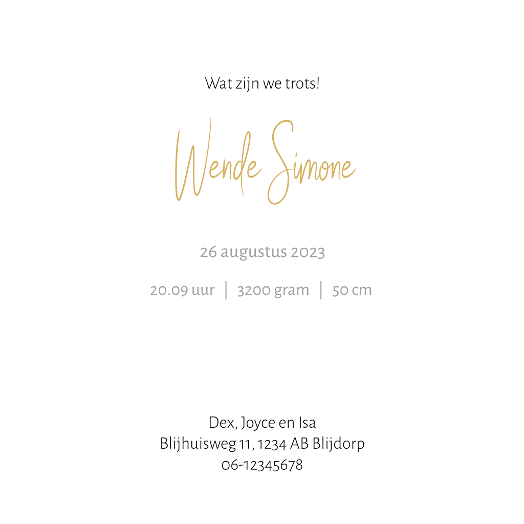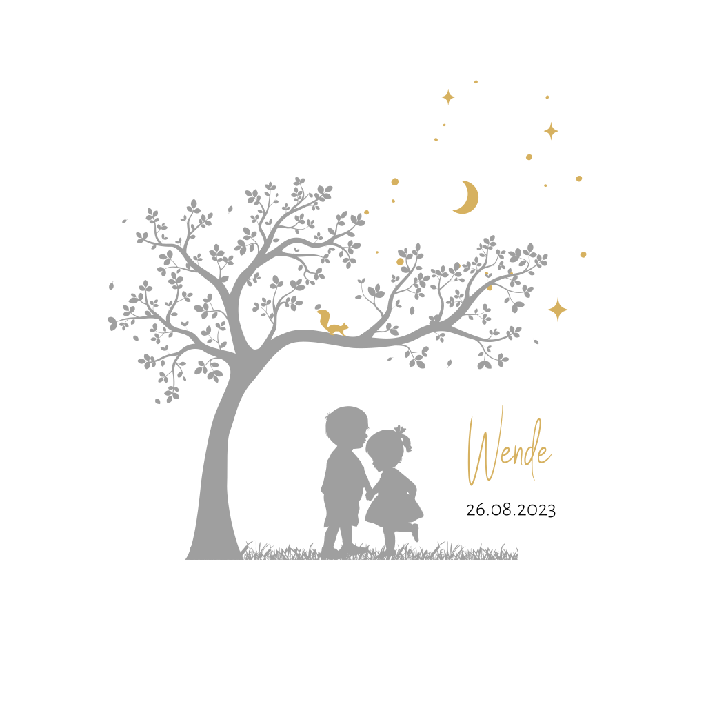 Een lief silhouet geboortekaartje voor een baby zusje. Op dit silhouet kaartje Wende staat een grote broer met zijn kleine baby zusje. De broer geeft het kleine meisje een kusje. Verder op dit kaartje een boom, eekhoorn, maan en sterretjes. Teksten en kleuren, evenals het silhouet zijn aan te passen in de editor.