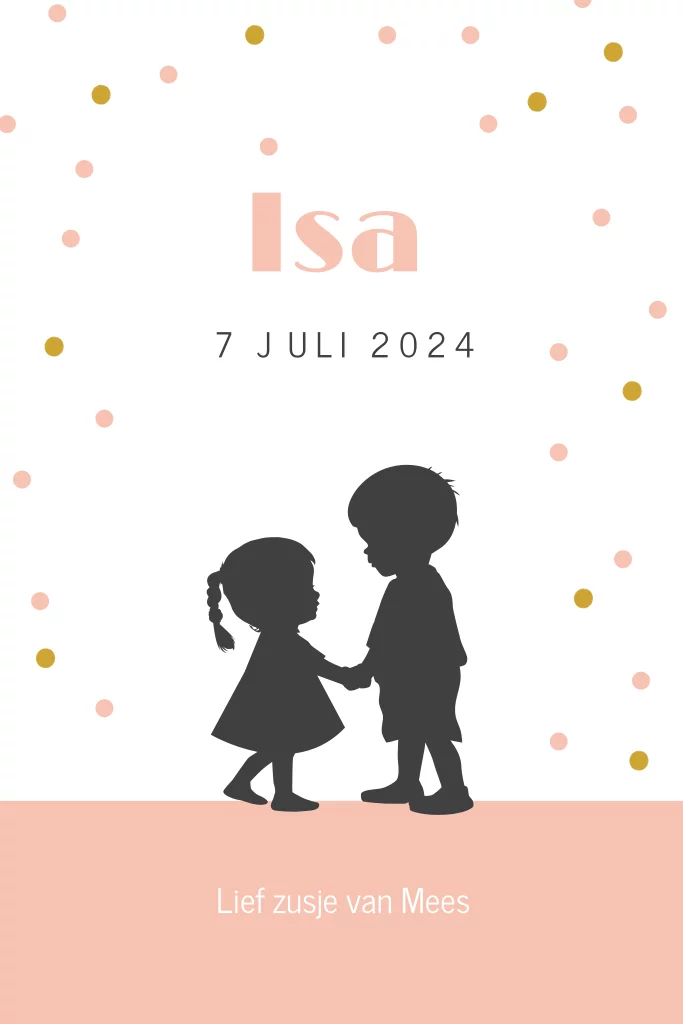 Mooi kaartje voor een tweede kindje. Silhouet geboortekaartje met grote broer en baby zusje. Leuk tafereeltje van twee kindjes die elkaars hand vast houden. De stippen achtergrond geeft een speels effect.
