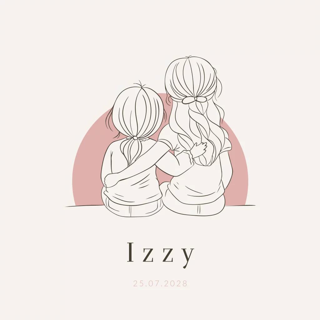 Prachtig geboortekaartje met een lijntekening van twee zusjes, perfect voor de aankondiging van de geboorte van jullie tweede kindje. De tekening toont een lieflijk tafereel van een grote zus met haar kleine zusje bij een ondergaande zon.
