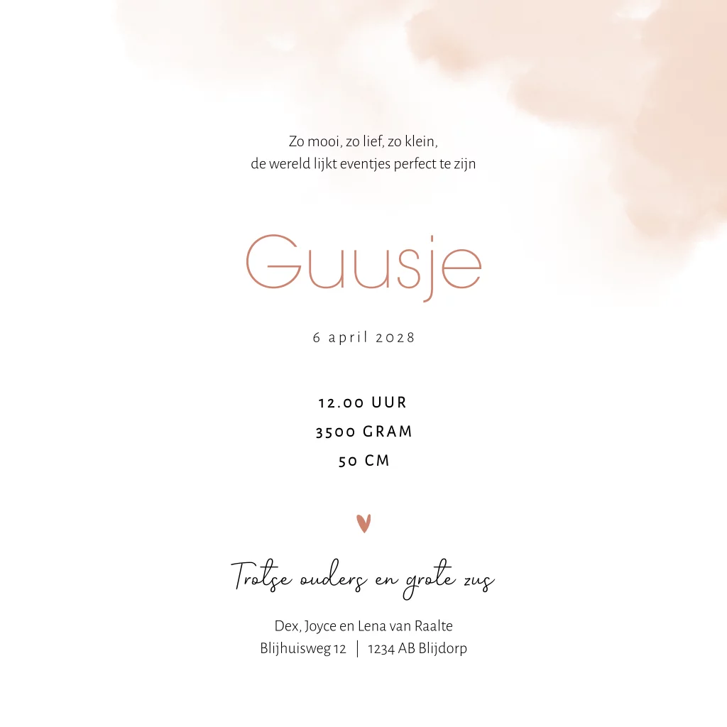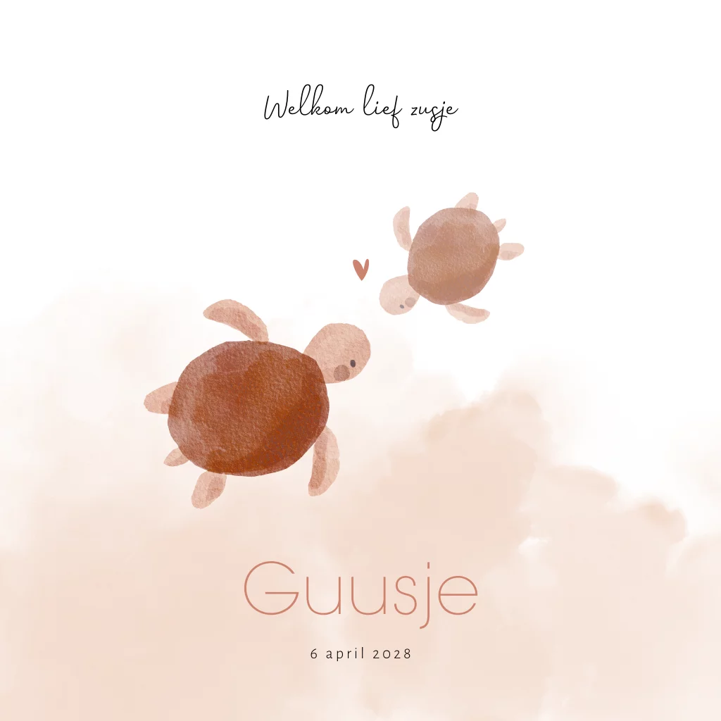 Op zoek naar een lief geboortekaartje voor je tweede kindje? Bekijk dan dit prachtige kaartje met twee geschilderde schildpadjes. Een grote zus met haar kleine zusje. Het kaartje is voorzien van een mooie roze aquarel achtergrond. Dit kaartje Guusje is ook mogelijk in een andere gezinssamenstelling.