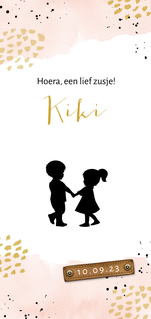 Hip geboortekaartje voor een tweede kindje (een zusje) met aquarel watercolor en leren label op de voorkant. Het silhouetje is van een grote broer en zijn kleine baby zusje. Op de achterkant van het babykaartje Kiki staan de geboortegegevens ook in leren labeltjes. Super leuk geboortekaartje met een stoer tintje door de stipjes en tijgerprint vlekjes.