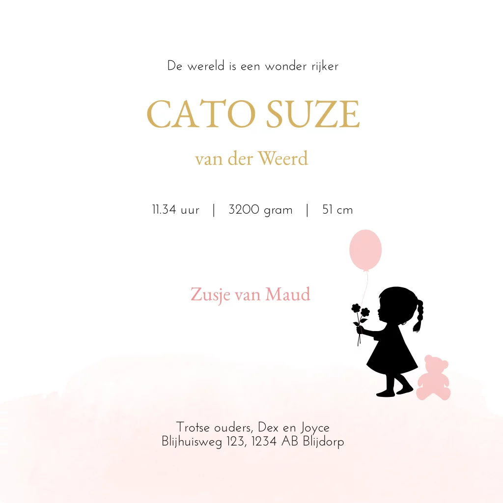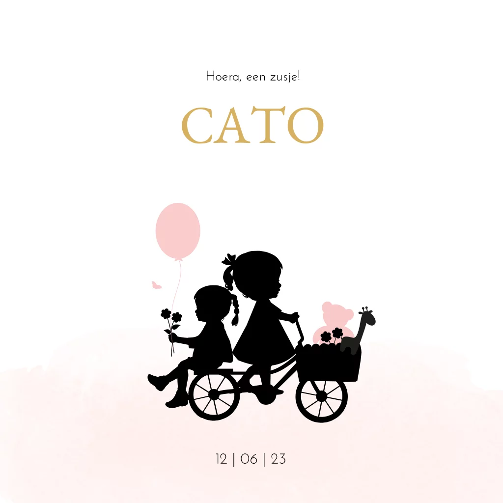 Mooi silhouet geboortekaartje met twee zusjes op de bakfiets. Het kleine zusje op deze babykaart heeft in haar hand een ballon en bloempjes. Ook zitten er in de mand naast de knuffel beer bloemen. De aquarel op de achtergrond geeft een mooi effect.