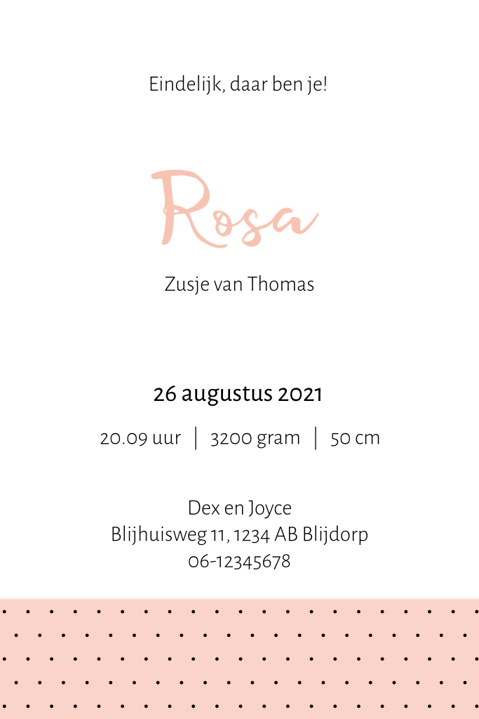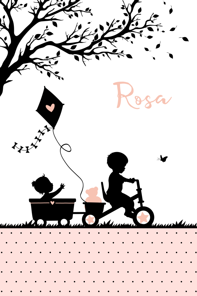 Hip silhouet geboortekaartje voor een zusje. Op dit kaartje fietst een jongetje op een driewieler met daarin een knuffeltje en daarachter een karretje met zijn kleine baby zusje. Aan de fietst zit een vlieger met een hartje. Dit babykaartje met de naam Rosa heeft een stippen patroon aan de onderzijde. De combinatie met de kleur perzik roze met zwart geeft de kaart een hippe look.