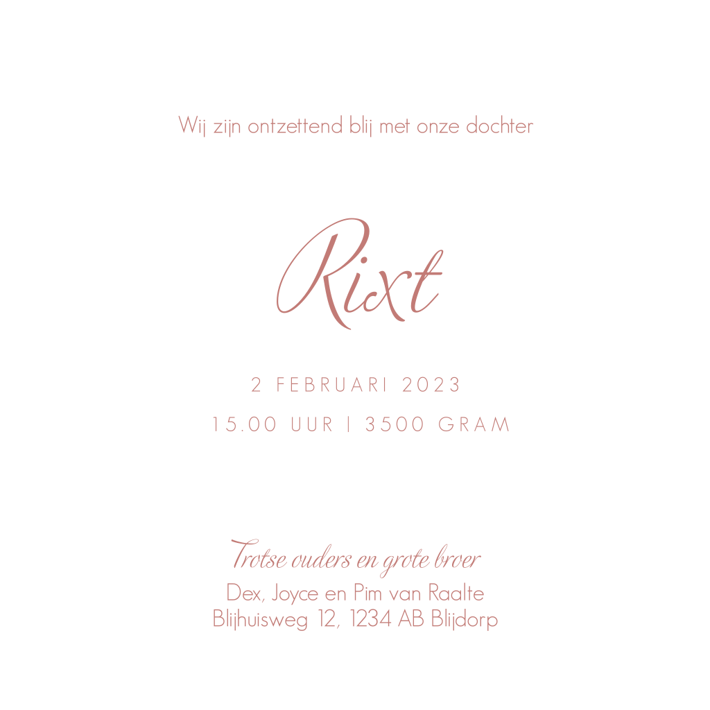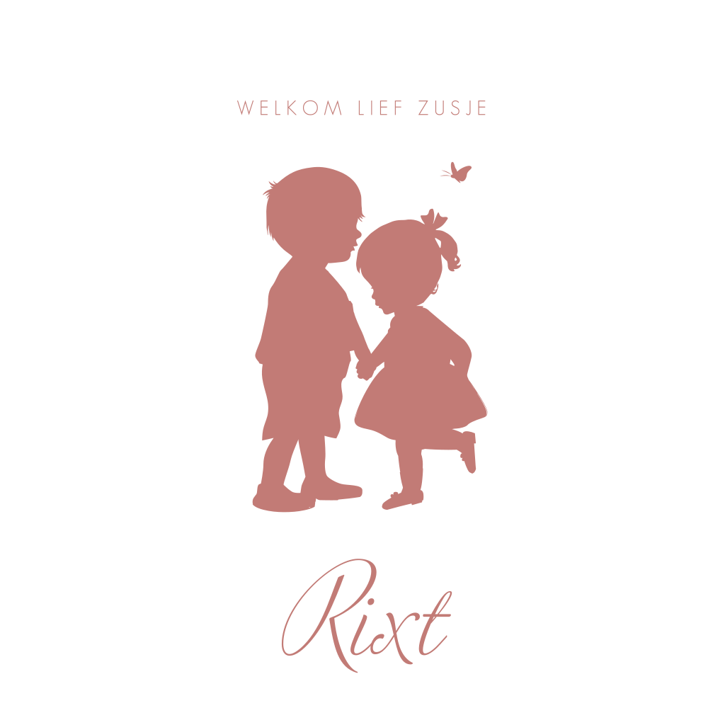 Basic silhouet geboortekaartje voor een tweede kindje, een grote broer met een klein zusje. Op dit babykaartje Rixt geeft een grote broer zijn kleine zusje een kusje op haar voorhoofd. Kleuren en teksten pas je eenvoudig aan in de editor.