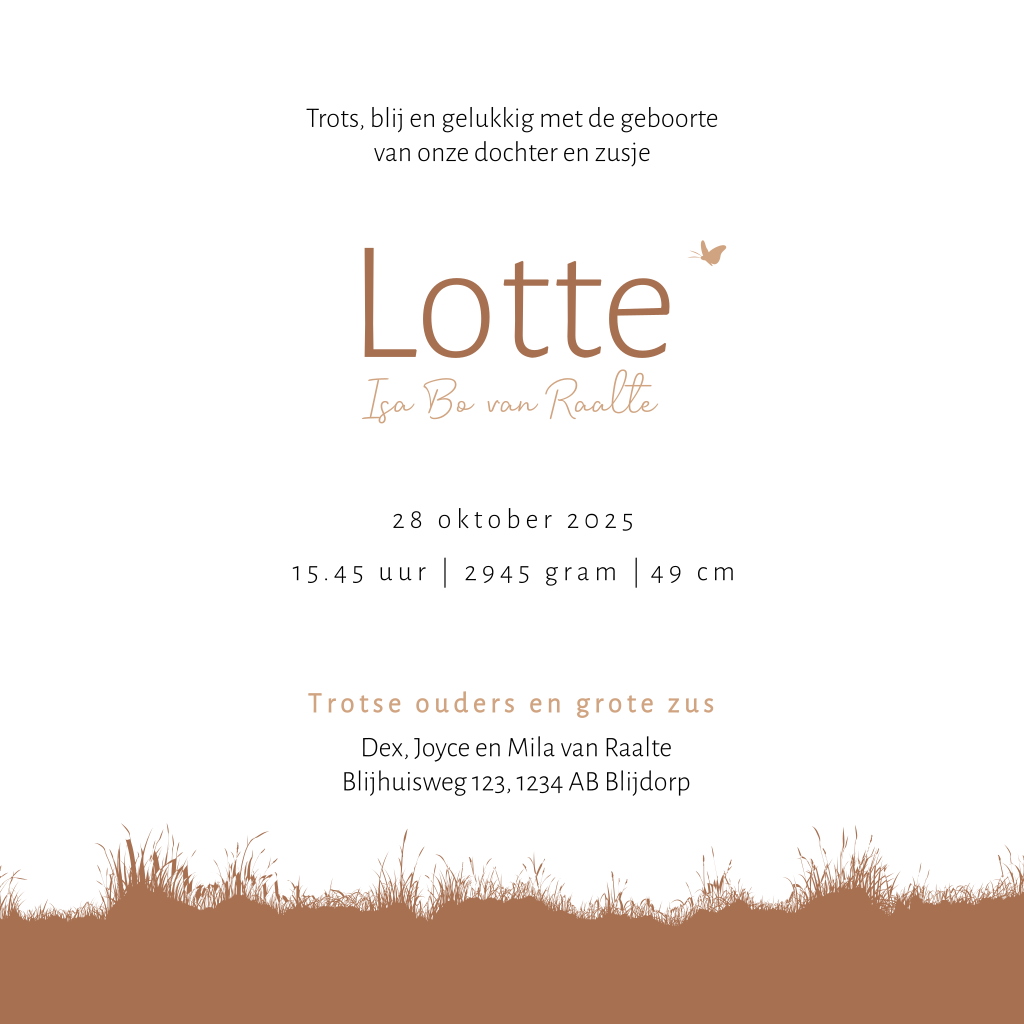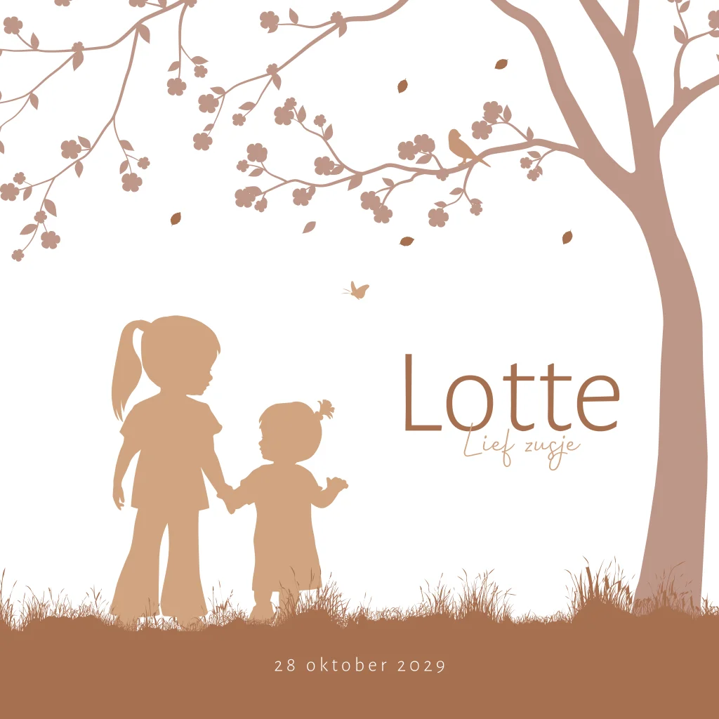 Hip silhouet geboortekaartje met een grote zus en een klein zusje in trendy kleuren die helemaal van nu zijn! Pas dit kaartje Lotte naar je eigen smaak aan in de editor en combineer met een mooie envelop om het helemaal af te maken.