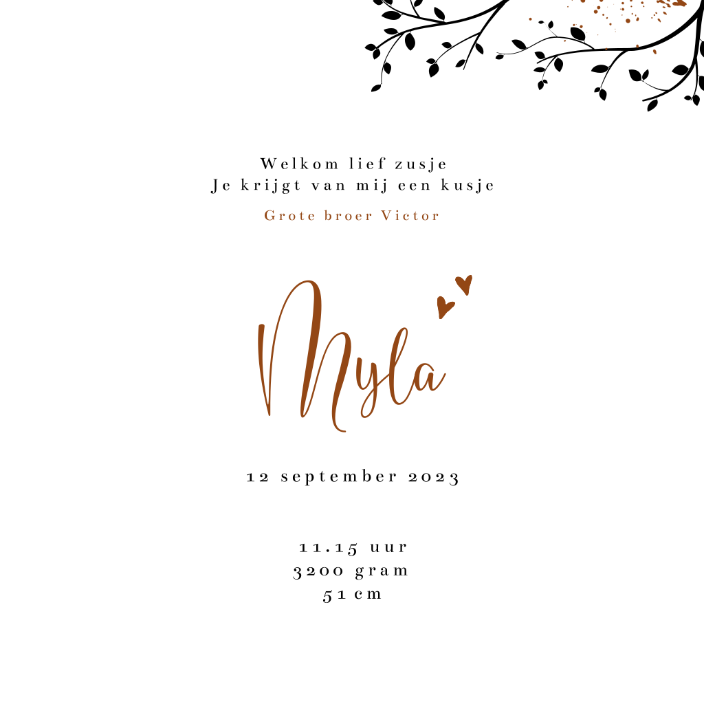 Herfst silhouet geboortekaartje voor een tweede kindje, een meisje. Op dit babykaartje Myla geeft een grote broer een kusje op het voorhoofd van zijn kleine zusje. Verder op dit kaartje bomen, een konijntje, hertje en paddenstoelen. Een mooie kleurencombinatie van wit, met zwart en roestbruin. Teksten en kleuren, evenals het silhouet zijn aan te passen in de editor.