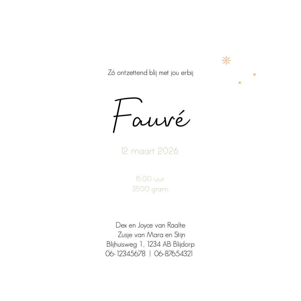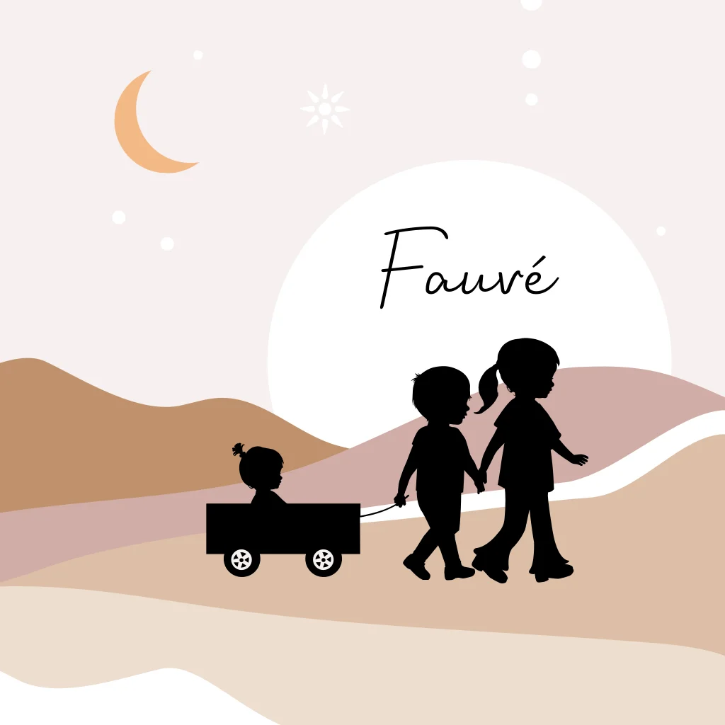 Superleuk silhouet geboortekaartje voor een zusje! Op dit meisjeskaartje Fauvé zie je een broer en zus wandelen met hun babyzusje in de bolderkar. Op de achtergrond de maan, ondergaande zon en een glooiend landschap in natuurlijke, trendy kleuren. Teksten, kleuren en silhouetten kun je eenvoudig aanpassen in de editor. Dit silhouet geboortekaartje is ook mogelijk voor een andere gezinssamenstelling. Vragen of hulp nodig? We staan voor je klaar!