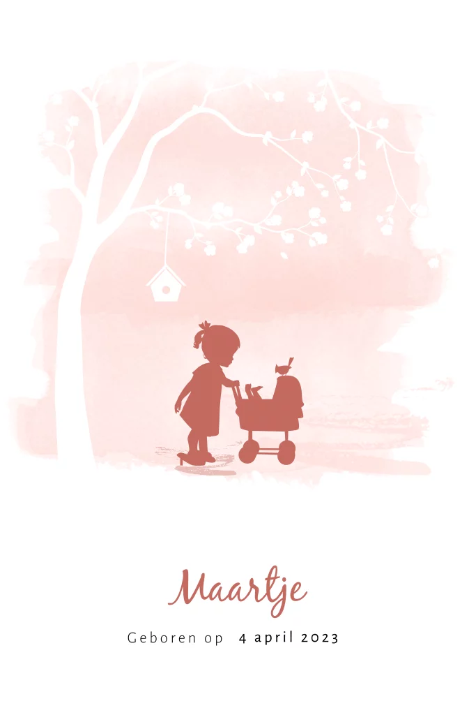 Lief geboortekaartje voor een tweede meisje, een zusje. Op dit kaartje Maartje staat een grote zus op hakjes kijkend in de kinderwagen waarin haar kleine zusje ligt. Verder op dit kaartje een watercolor achtergrond en een boom met een vogelhuisje. Pas de teksten en kleuren naar wens aan in de editor.