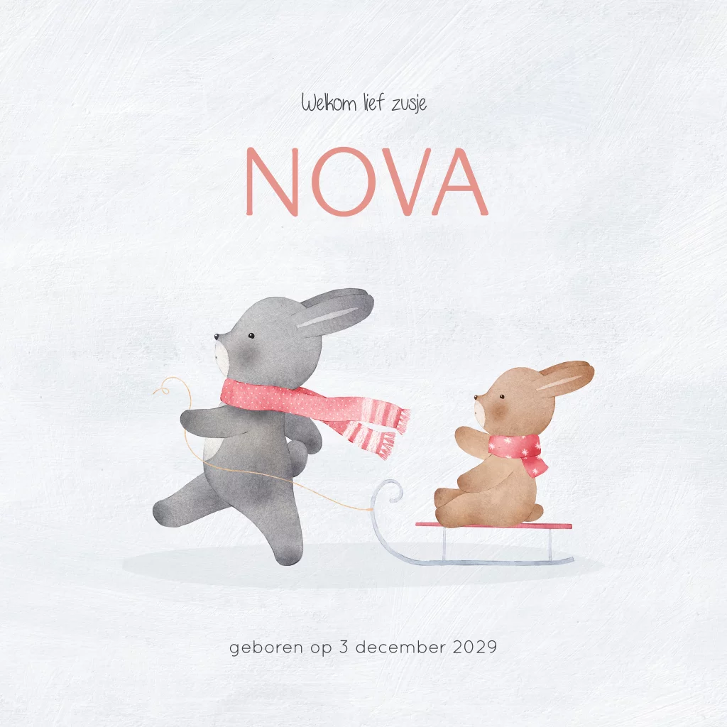 Zusje geboortekaartje met konijnen op een slee in de winter