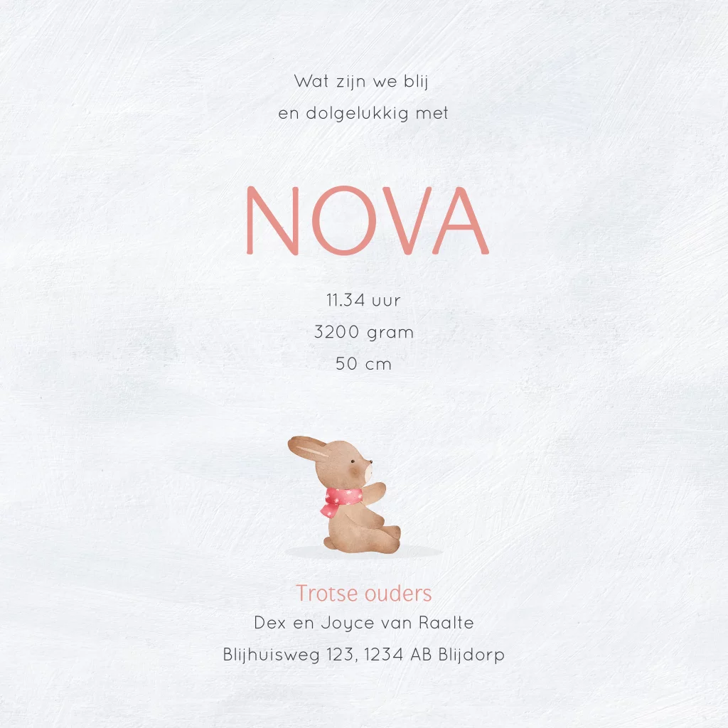 Dit winter geboortekaartje met een illustratie van twee konijnen op een slee is een perfecte keuze voor een zusje geboortekaartje. Pas de lettertypes en kleuren van dit geboortekaartje Nova naar je eigen smaak aan in de editor. Hulp nodig? Bel, mail of chat ons!