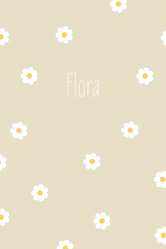 Meisjes geboortekaartje Flora met patroon van madeliefjes. Dit kaartje met afgeronde hoeken heeft een egale, trendy beige achtergrond. Pas dit bloemen babykaartje voor een dochter naar je eigen smaak aan in de editor.