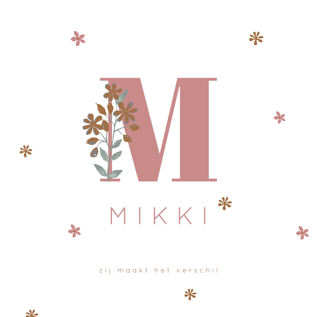 Geboortekaartje voor een meisje met initiaal en kleine bloempjes. Dit babykaartje Mikki is overwegend wit met de voorletter en de bloemetjes in warme roze tinten.