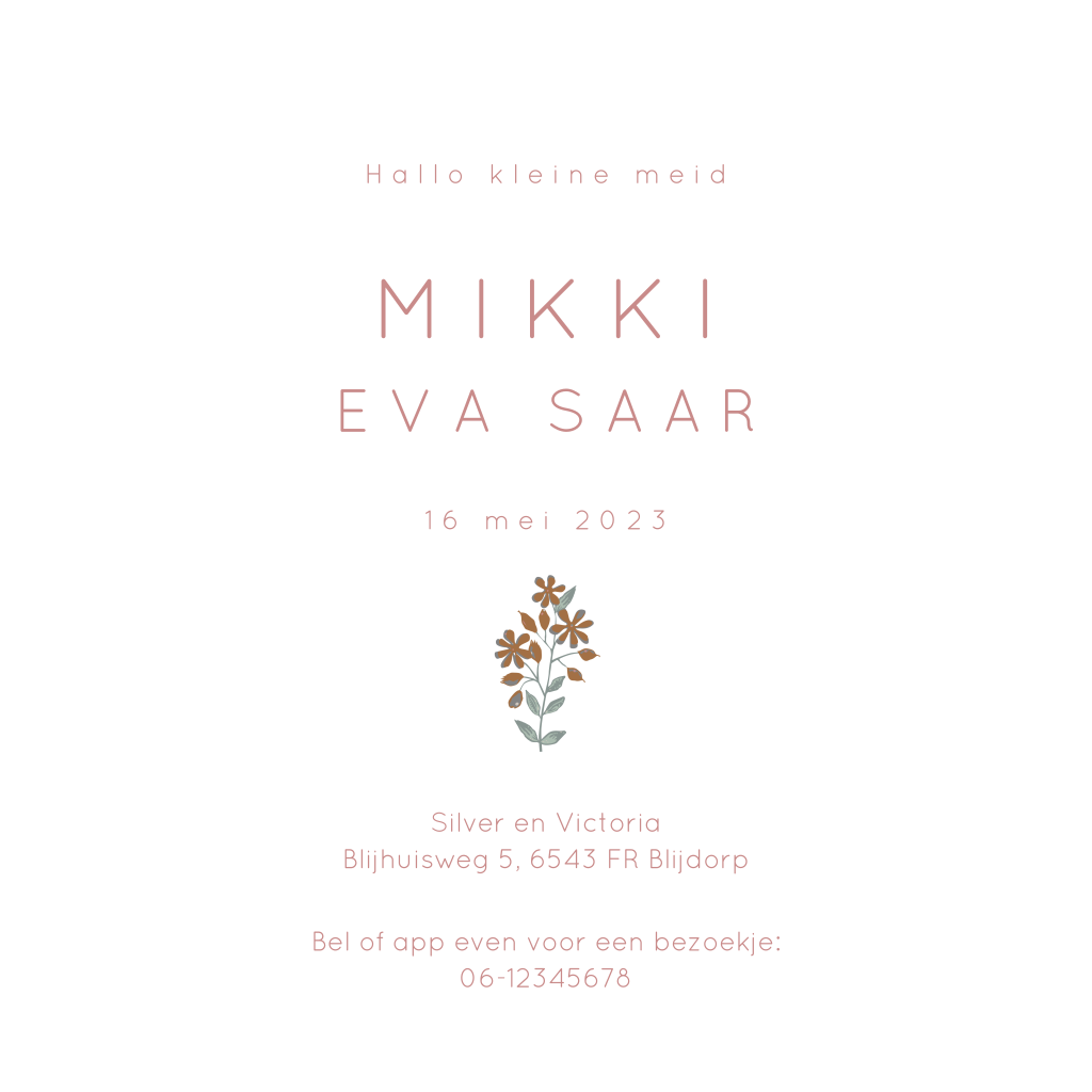 Dit geboortekaartje is een ontwerp van Jollein® uit de Bloom collectie en is speciaal in samenwerking met Jollein® ontworpen. Alle designelementen staan daarom vast waardoor het ontwerp zelf niet aanpasbaar is. Je kunt de teksten uiteraard wel gemakkelijk aanpassen in de editor.
