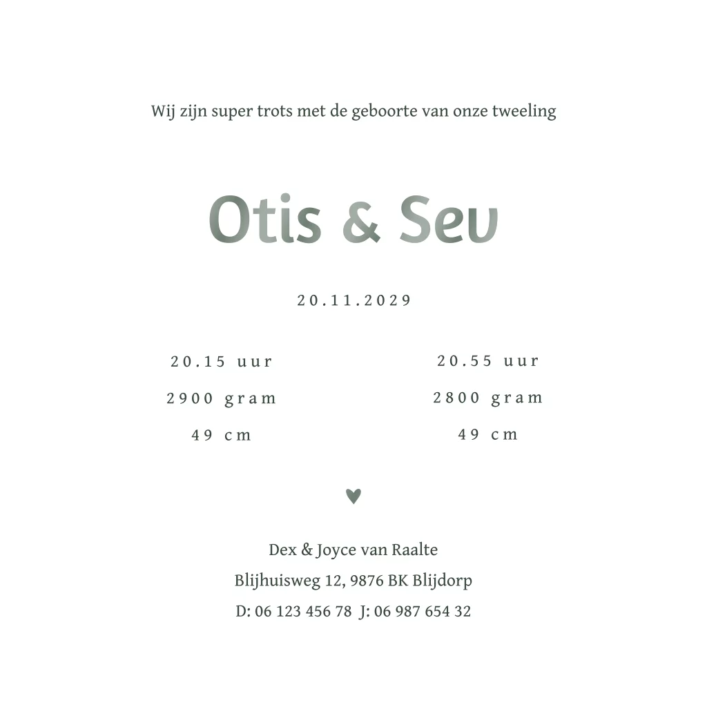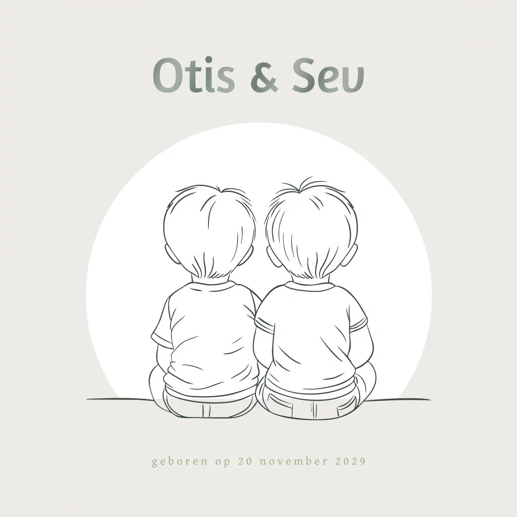 Hoera jullie jongens tweeling is geboren! Laat het iedereen weten met dit prachtige unieke tweeling geboortekaartje. Op dit kaartje Otis en Sev staat een lijntekening van twee jongens die naast elkaar naar de horizon zitten, vriendjes voor het leven! De namen worden in een groene hoogglans gedrukt. Pas de lettertypes en kleuren naar je eigen smaak aan de editor. Ook mogelijk in een andere gezinssamenstelling. Hulp nodig? Laat het ons weten!