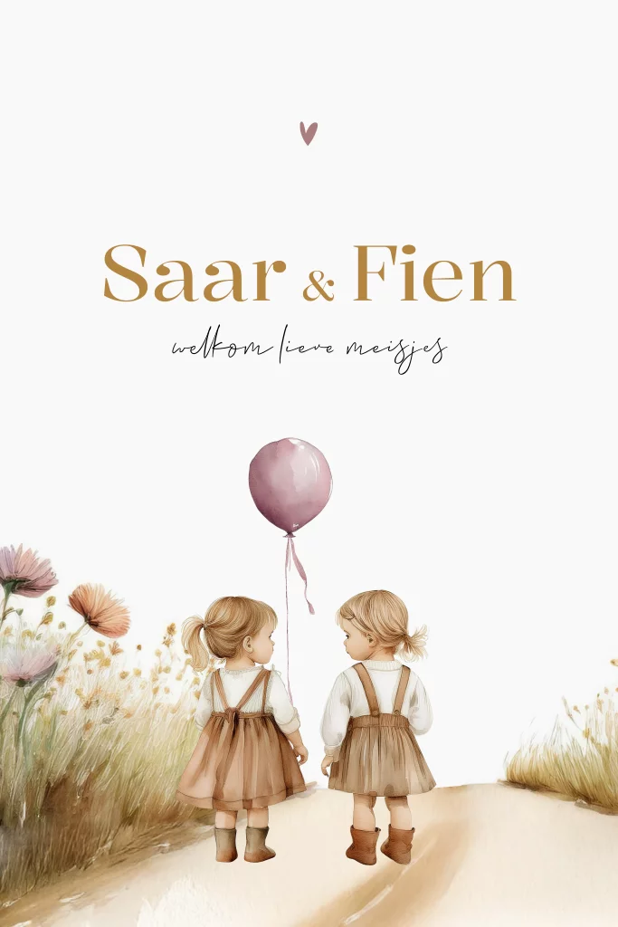 Een lief geboortekaartje voor een meisjes tweeling met ronde hoeken. Op dit kaartje zie je twee schattige meisjes samen in een aquarel landschap staan tussen de bloemetjes. Één van de twee meisjes heeft een ballon in de hand. Pas dit geboortekaartje Saar en Fien naar eigen wens aan in onze online editor voor jullie dochters. Met de berry envelopkleur maak je het kaartje voor jullie tweeling helemaal af.