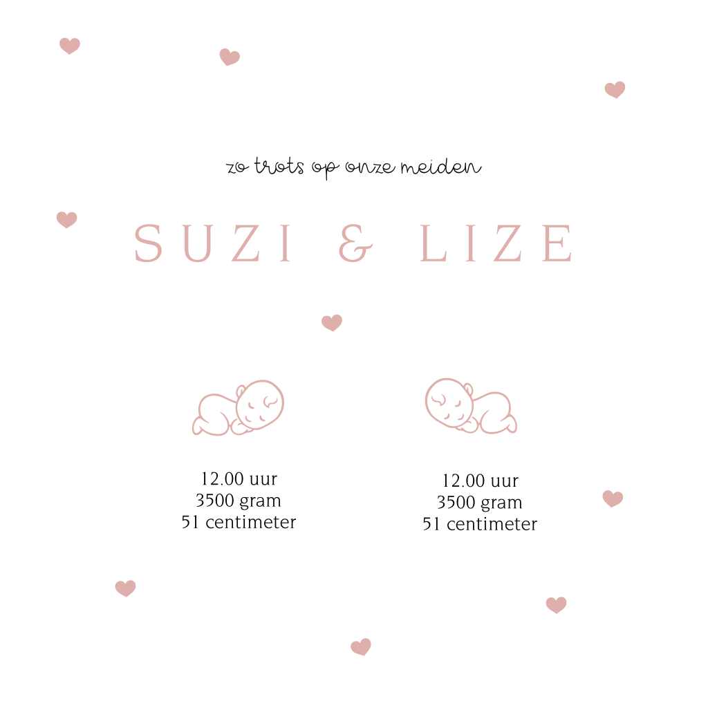 Dit geboortekaartje is voor een meisjestweeling. De tweeling Suzi en Lize staan centraal bij dit schattige babykaartje. De hartjes en de roze kleur maken de kaart extra schattig. Deze kaart is gemakkelijk om te zetten naar een kaart voor een jongens tweeling.