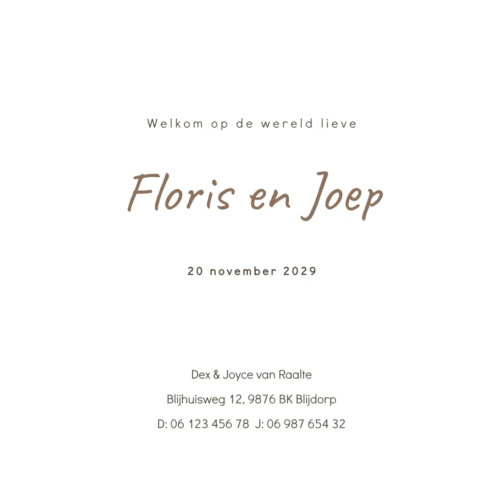 Hoera, jullie tweeling is geboren! Daar past dit schattige tweeling geboortekaartje Floris en Joep goed bij. Dit kaartje bevat een schattige illustratie van twee ondeugende babyaapjes. De achtergrond heeft een rustig gestreept patroon in beige kleurtinten. Pas de lettertypes en kleuren naar je eigen smaak aan in de editor. Met de olijfgroene envelopkleur maak je dit kaartje helemaal in stijl af.