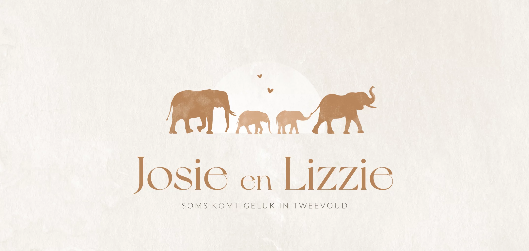 Een rustig geboortekaartje voor een tweeling met een silhouet van een olifanten gezin. Dit geboortekaartje Josie en Lizzie heeft een beige achtergrond kleur waar envelopkleur metallic beige heel mooi bij past! Dit geboortekaartje is zowel te gebruiken voor twee jongetjes, twee meisjes als voor een jongen en een meisje tweeling. Pas de kleuren en teksten makkelijk zelf aan in onze online editor.