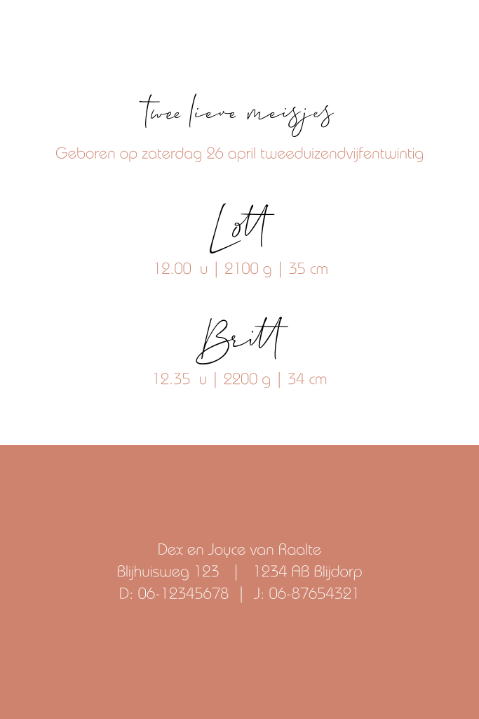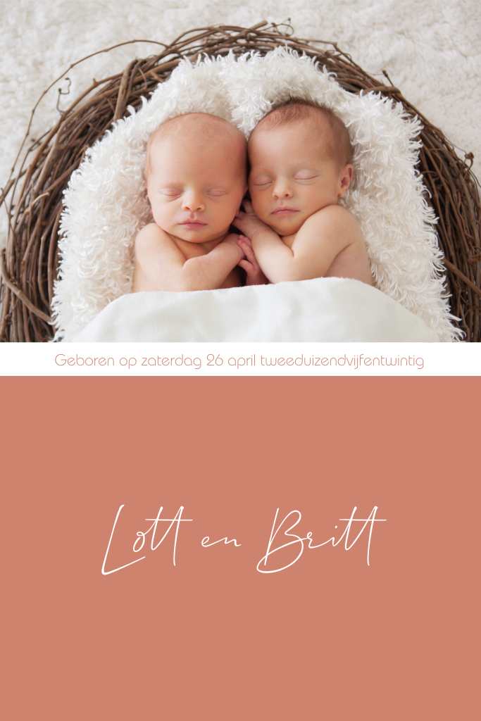 Dit foto geboortekaartje is voor een meisjes tweeling. De roze kleur op de achtergrond maakt het extra schattig. De roze kleur is op deze babykaart is goed aan te passen. Het kaartje heeft een rustige en eenvoudige uitstraling, waardoor de aandacht naar de babyfoto gaat.