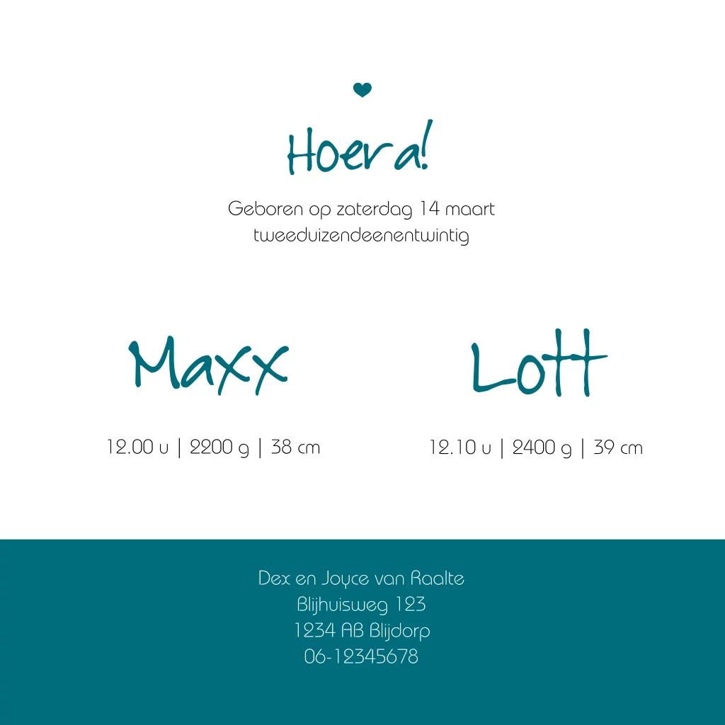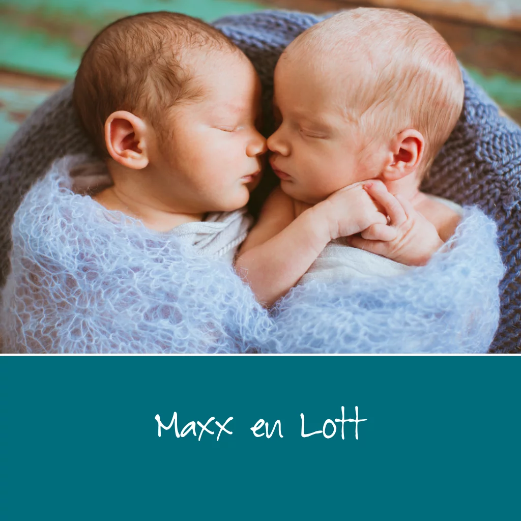 Tweeling geboortekaartje met ruimte voor eigen foto. De kleur petrol blauw zorgt ervoor dat de kaart voor een jongen en meisjes tweeling gebruikt kan worden.