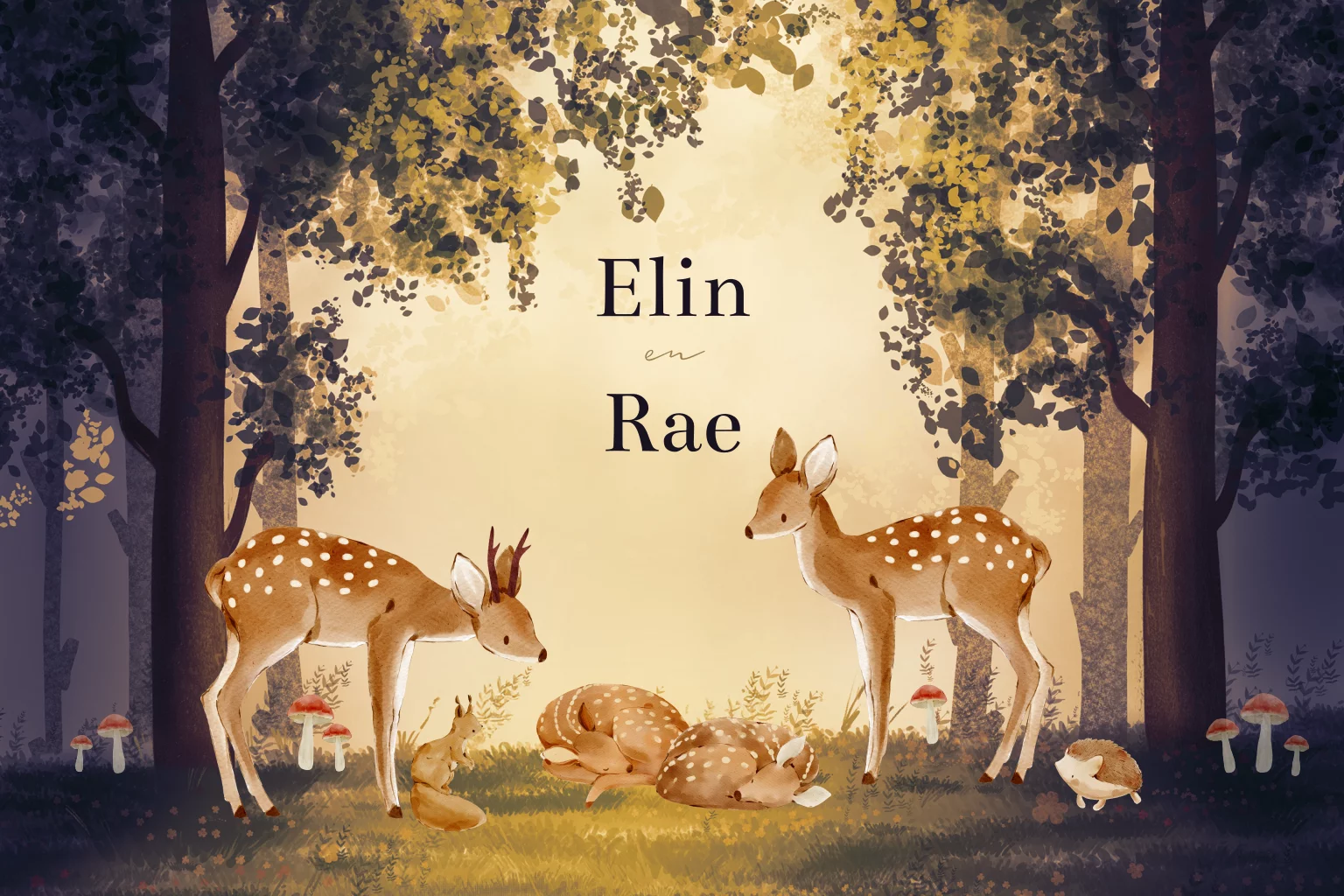 Op zoek naar een illustratief geboortekaartje voor een tweeling? Dit prachtige unisex geboortekaartje Elin en Rae is perfect voor de aankondiging van de geboorte van jullie twee kindjes. Op dit kaartje zie je twee hertjes met hun ouders in het bos. Een nieuwsgierige egel en eekhoorn komen ook even spieken bij de pasgeboren herten tweeling. De paddenstoelen en bruine kleuren van het kaartje geven het een herfstsfeer, perfect dus voor een tweeling die in de herfst wordt geboren!
