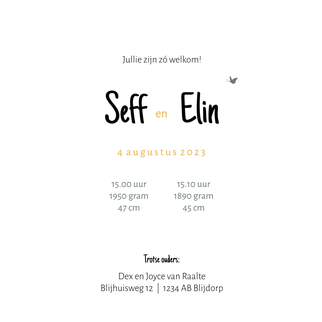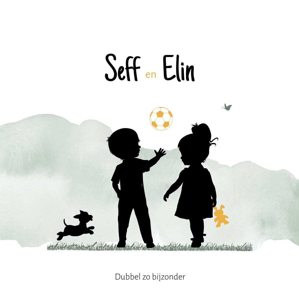 Lief silhouet geboortekaartje voor een tweeling jongen en meisje. Op dit baby kaartje met de namen Seff en Elin zie je een broer en zus. De jongen speelt met een voetbal en het meisje heeft een knuffeltje in haar hand. Op de achtergrond een aquarel in de kleur grijsgroen. Teksten en kleuren zijn naar je eigen smaak aan te passen. Dit kaartje is ook mogelijk in een andere gezinssamenstelling of met andere silhouetjes.