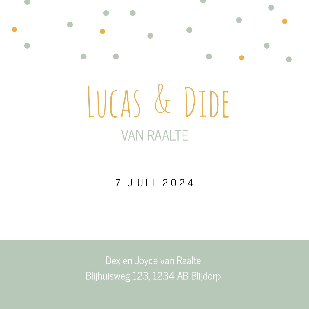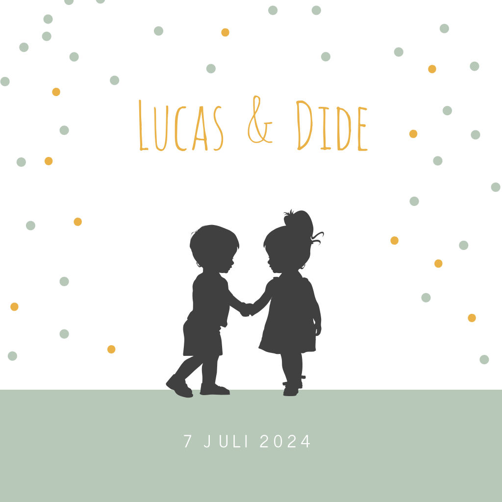 Hip en vrolijk tweeling geboortekaartje met de silhouetjes van een jongen en een meisje. Deze twee-eiige tweeling houdt elkaars handje vast. aan de binnenkant van deze babykaart Lucas en Dide staan geboorte symbolen. Deze kaart is gemakkelijk naar eigen wens aan te passen