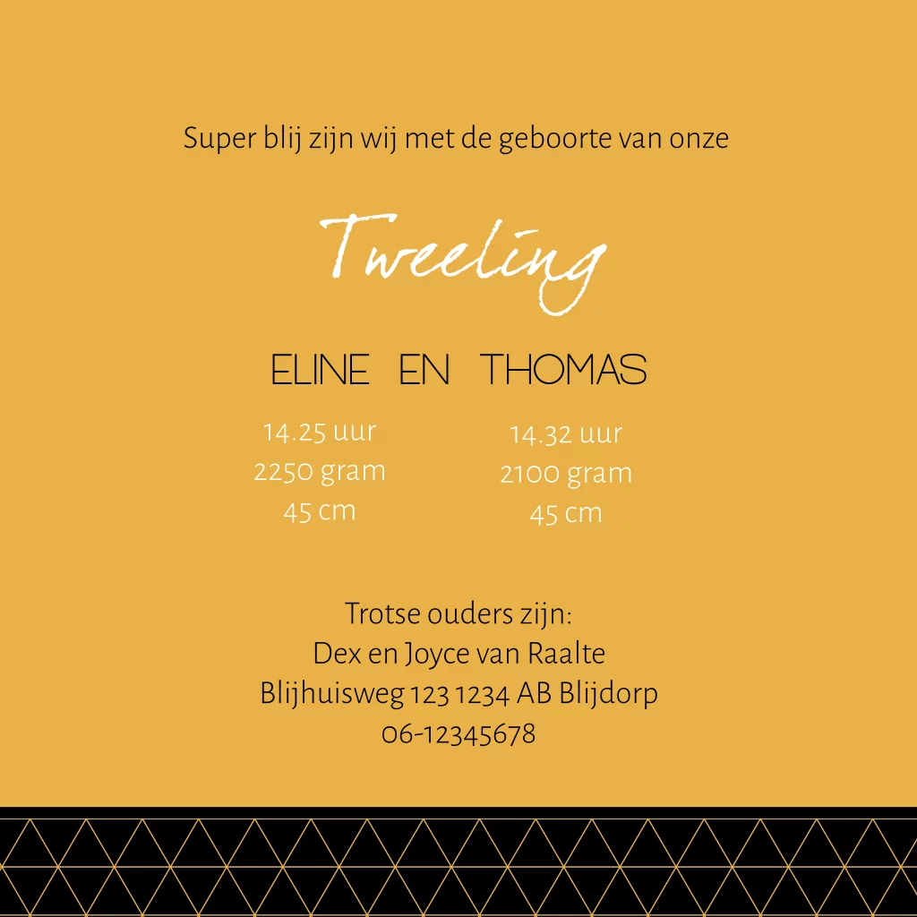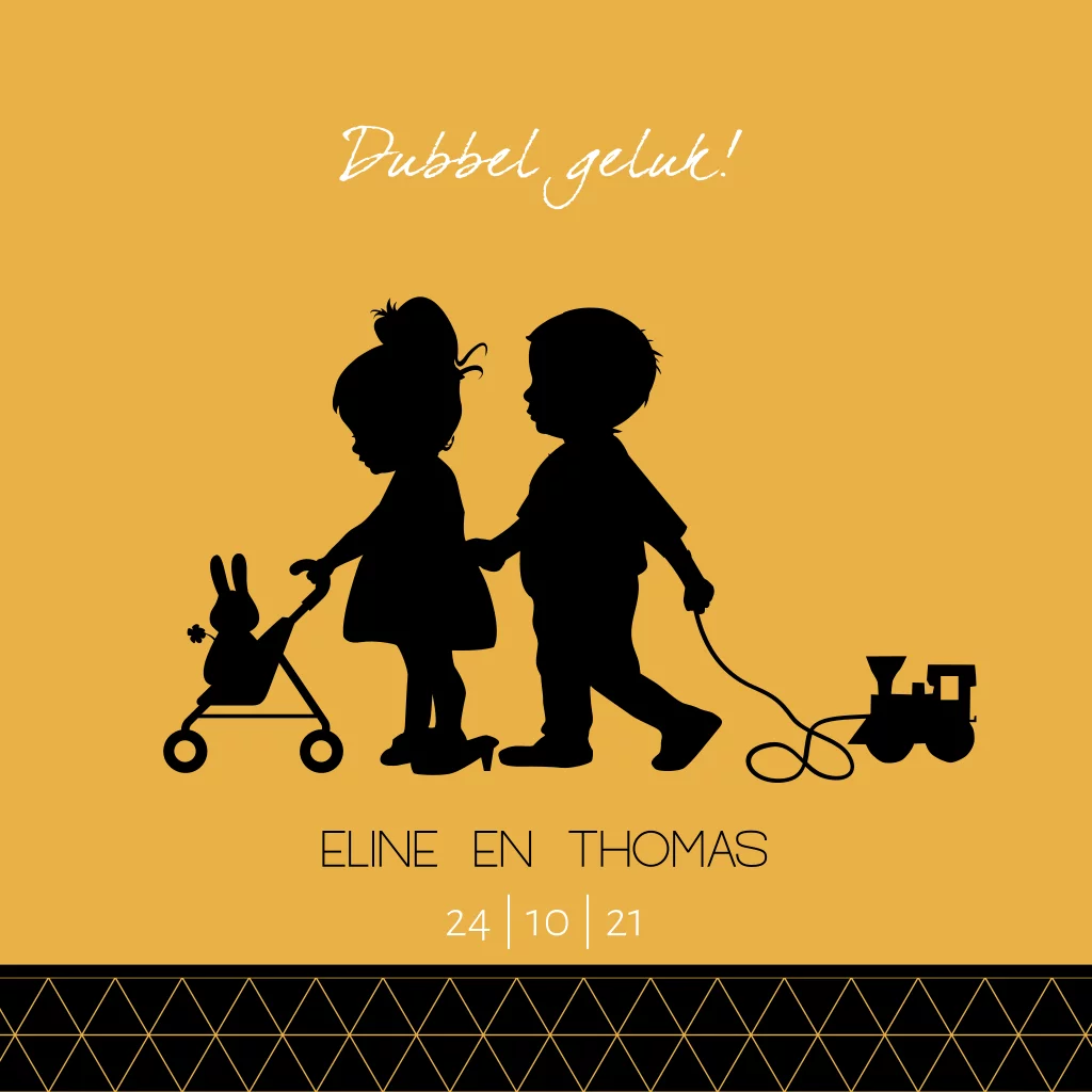 Dit geboortekaartje is voor een twee-eiige meisje en jongen tweeling. Door het silhouet van de twee kindjes is het duidelijk te zien dat het om een tweeling gaat. De jongen heeft een treintje vast en het meisje een poppenwagen met knuffel. Opvallend is het geometrische patroon in de rand. De babynamen Eline en Thomas staan in een strak lettertype. Deze kaart is gemakkelijk aan te passen naar jouw wensen.