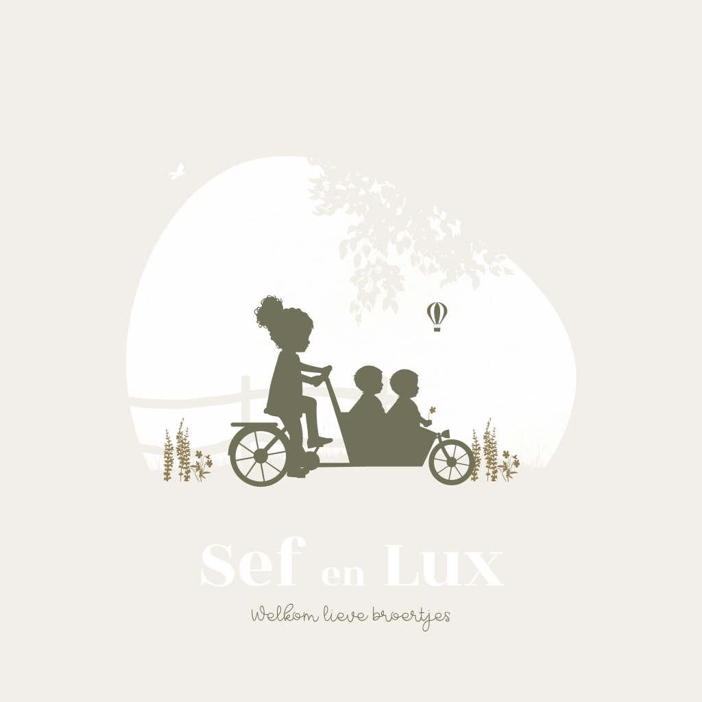 Een bijzonder kaartje voor een bijzondere geboorte van een tweeling. Dit geboortekaartje Stef en Lux heeft een beige achtergrond met een lief tafereeltje. Je ziet een grote zus fietsen met een bakfiets met daarin haar tweeling broertjes. De achtergrond heeft een organische vorm met boom, bloemetjes, vogeltjes en vlinder. De goudfolie geeft dit tweeling geboortekaartje een extra luxe uitstraling.