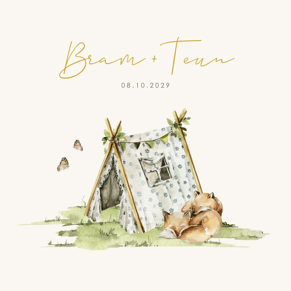 Tweeling vosjes geboortekaartje met tentje voor twee jongens