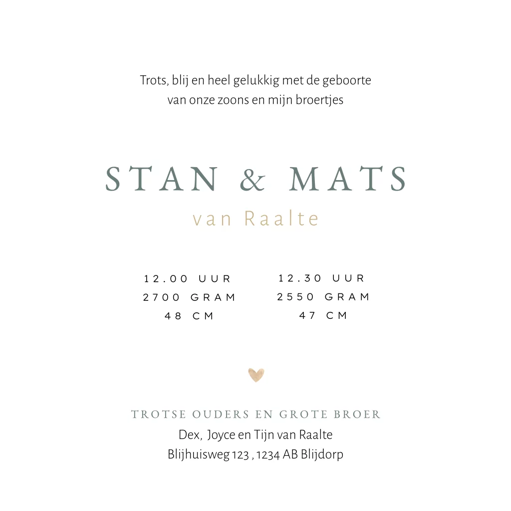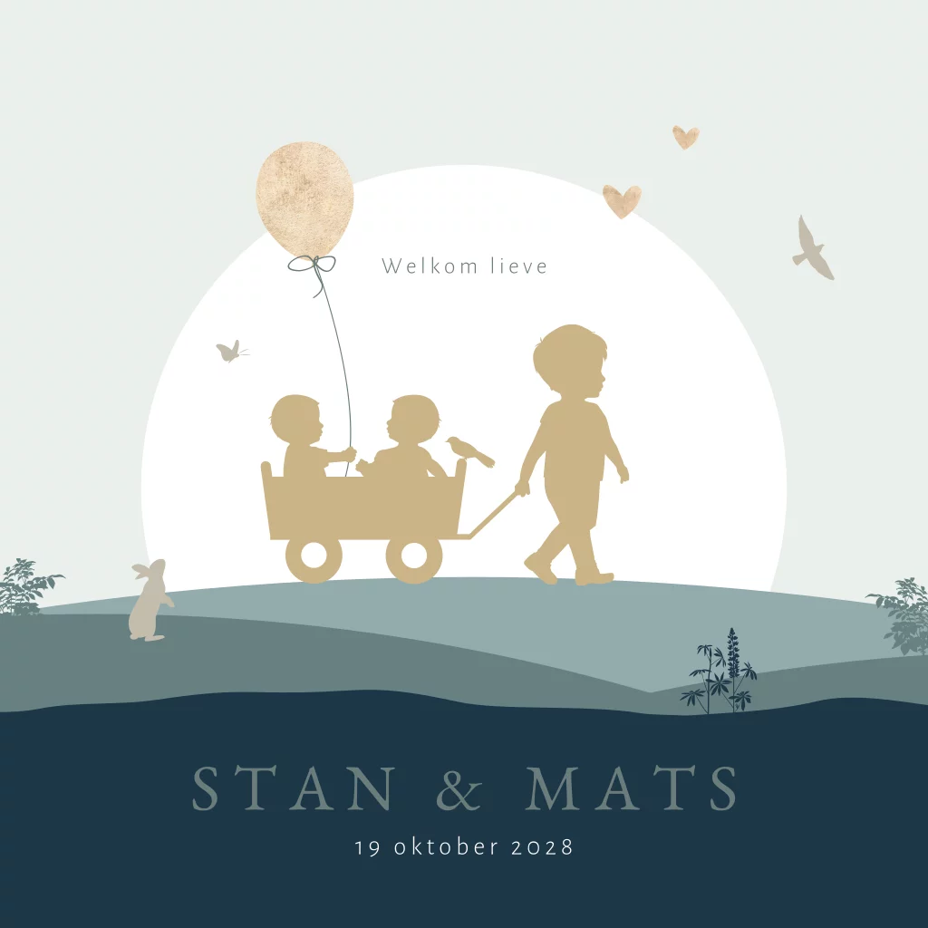 Dit unieke geboortekaartje is speciaal ontworpen voor de geboorte van tweeling jongens. Op dit tweeling geboortekaartje Stan en Mats zie je een grote broer een bolderkar trekken met daarin zijn twee broertjes. Eén broertje heeft een ballon vast en op de achtergrond zie je een konijn, vlinder, vogels en hartjes. De trendy blauw groene kleuren geven dit kaartje een hippe uitstraling. Teksten, kleuren en silhouetten kun je eenvoudig aanpassen in de editor. Dit geboortekaartje is ook mogelijk voor een andere gezinssamenstelling.