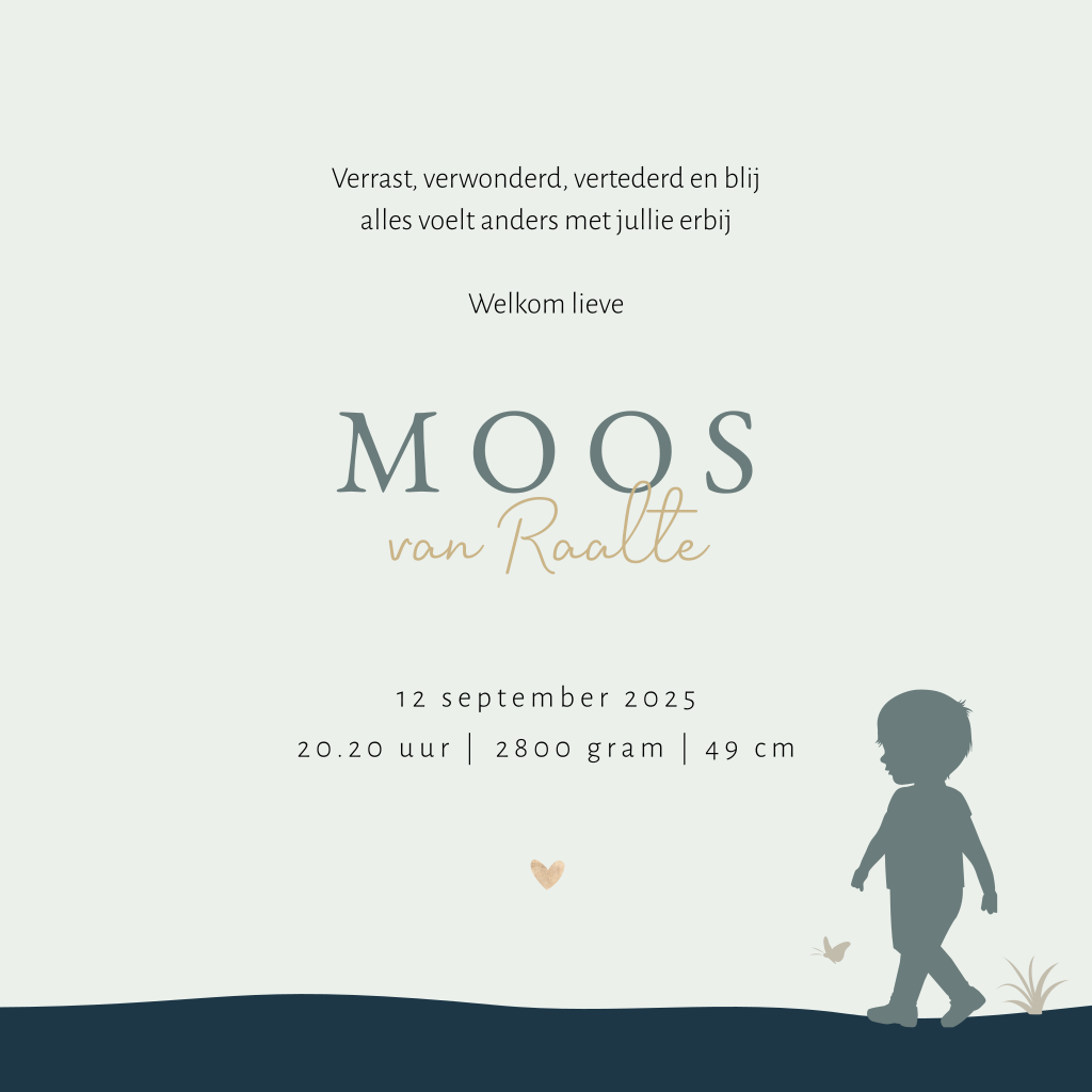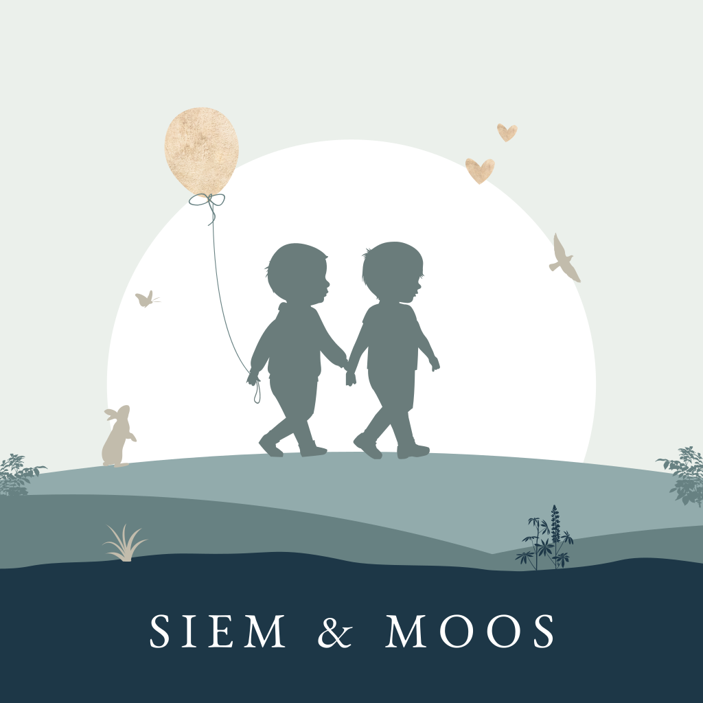 Tweeling silhouet geboortekaartje in blauwtinten voor een jongens tweeling! Op dit tweelingkaartje Siem en Moos zie je twee schattige broertjes, waarvan een met een ballon in zijn hand. Teksten, kleuren en silhouetten kun je eenvoudig aanpassen in de editor. Dit geboortekaartje is ook mogelijk voor een andere gezinssamenstelling.
