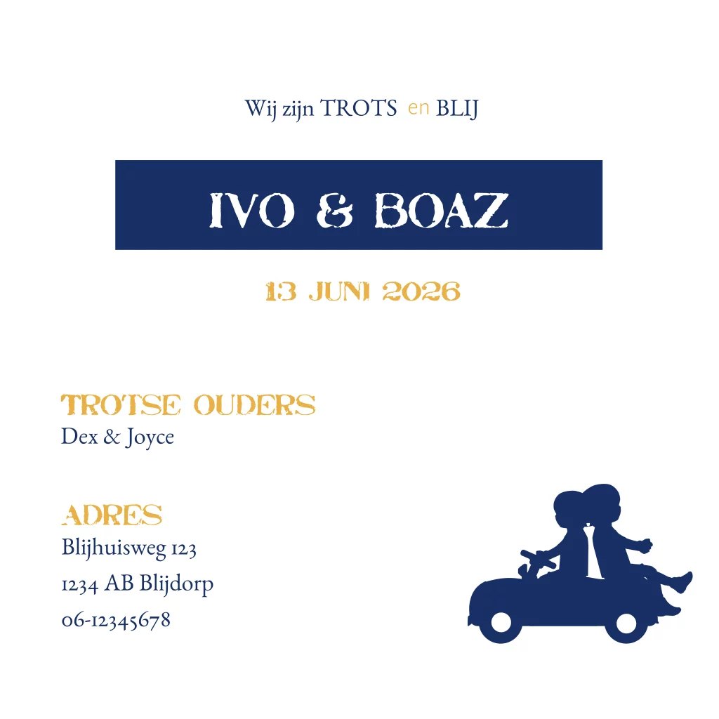 Dit geboortekaartje met leuke typografie is voor een jongens tweeling. Op deze kaart zitten 2 baby broertjes samen in een karretje. De kleuren en teksten zijn gemakkelijk aan te passen.
