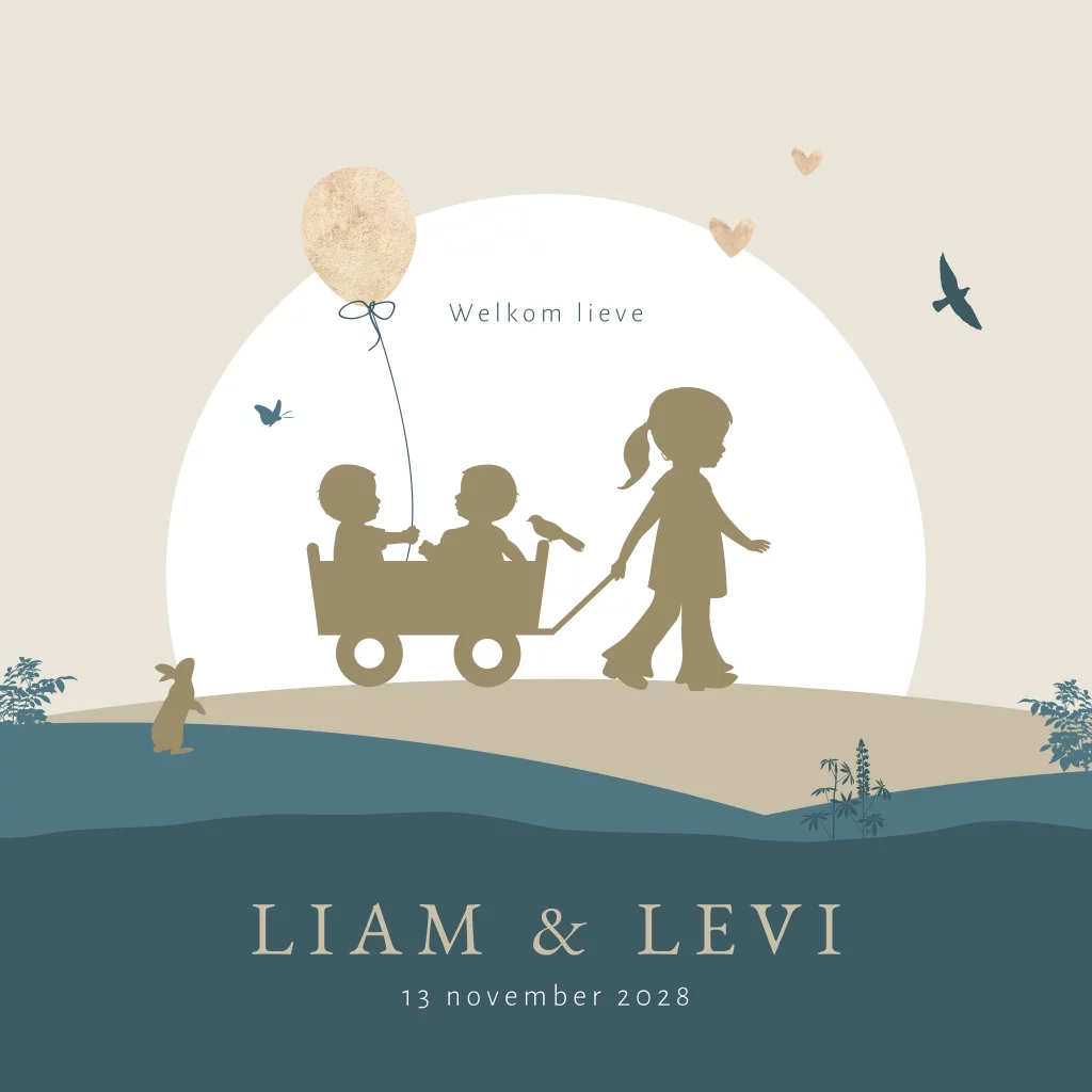 Dit unieke geboortekaartje is speciaal ontworpen voor de geboorte van tweeling jongens, met een lieve verwijzing naar hun grote zus. Op dit tweeling geboortekaartje Liam en Levi zie je een grote zus een bolderkar trekken met daarin haar twee broertjes. Een broertje heeft een ballon vast en op de achtergrond zie je een konijn, vlinder, vogel en hartjes. De trendy kleuren geven dit kaartje een hippe uitstraling. Teksten, kleuren en silhouetten kun je eenvoudig aanpassen in de editor. Dit geboortekaartje is ook mogelijk voor een andere gezinssamenstelling.