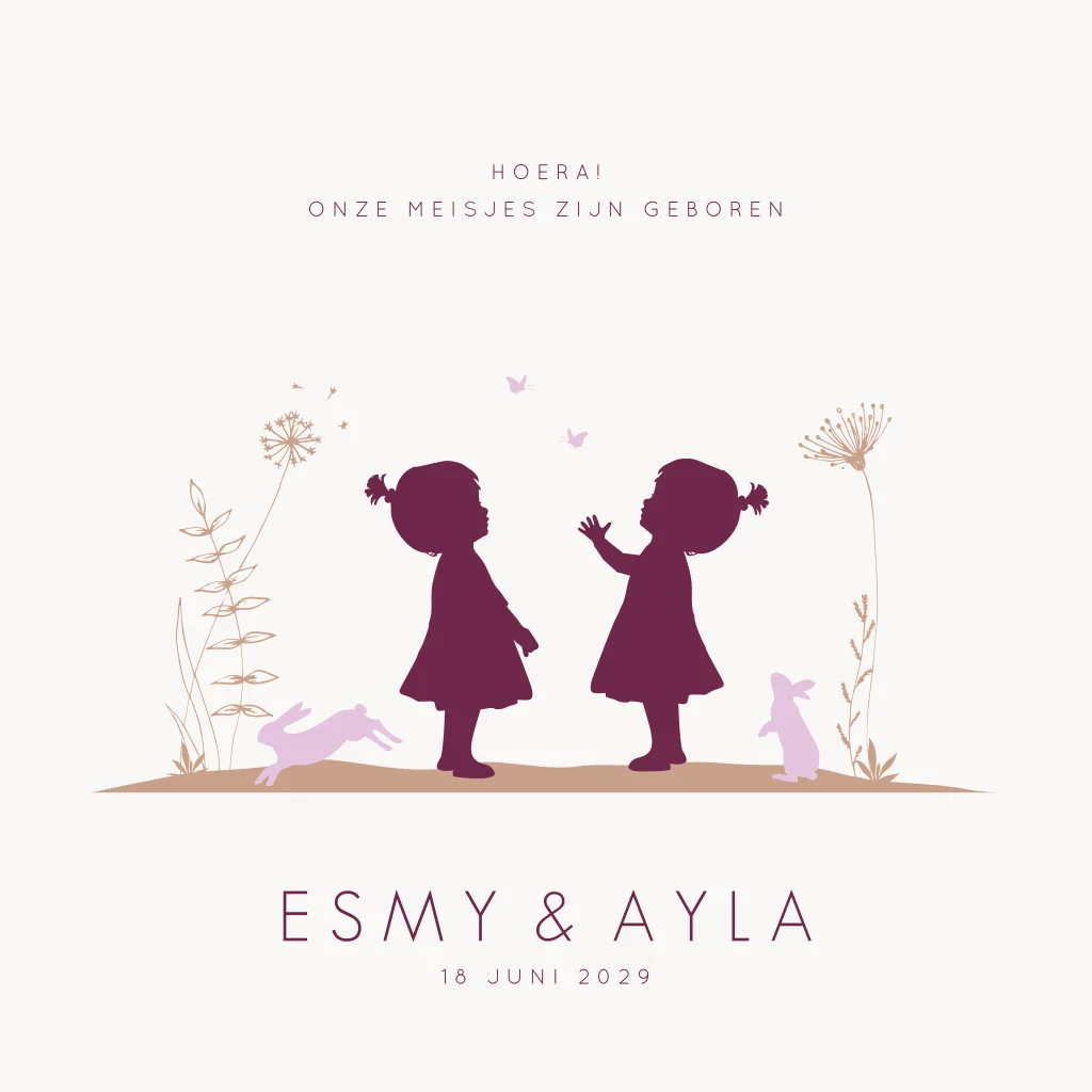 Tweeling geboortekaartje met het silhouet van 2 meisjes tussen mooie veldbloemen. Beide dochters kijken naar de fladderende vlinders boven hen. Ook zie je twee nieuwsgierige haasjes op dit kaartje met afgeronde hoeken.