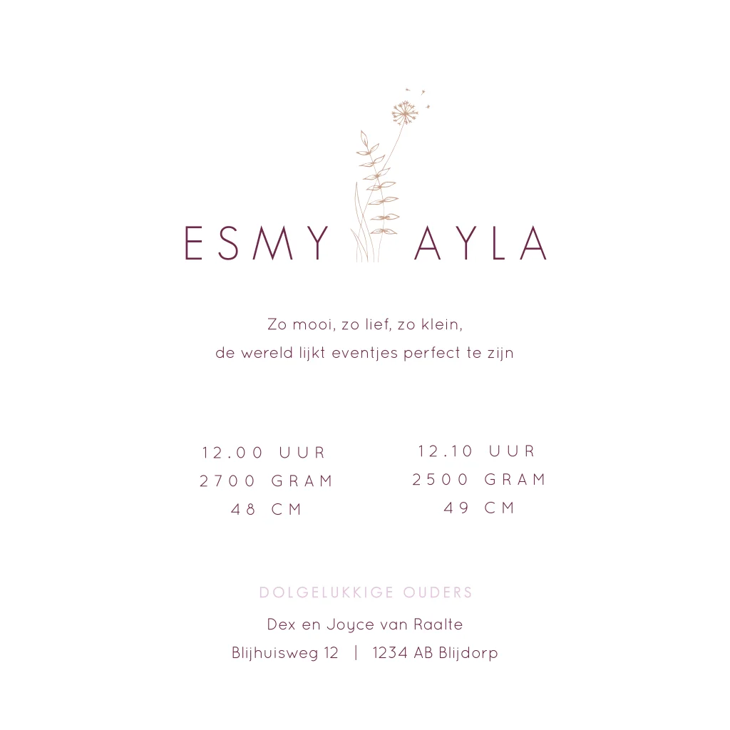 Je kunt dit geboortekaartje Esmy en Ayla zelf gemakkelijk bewerken, opslaan en bestellen.