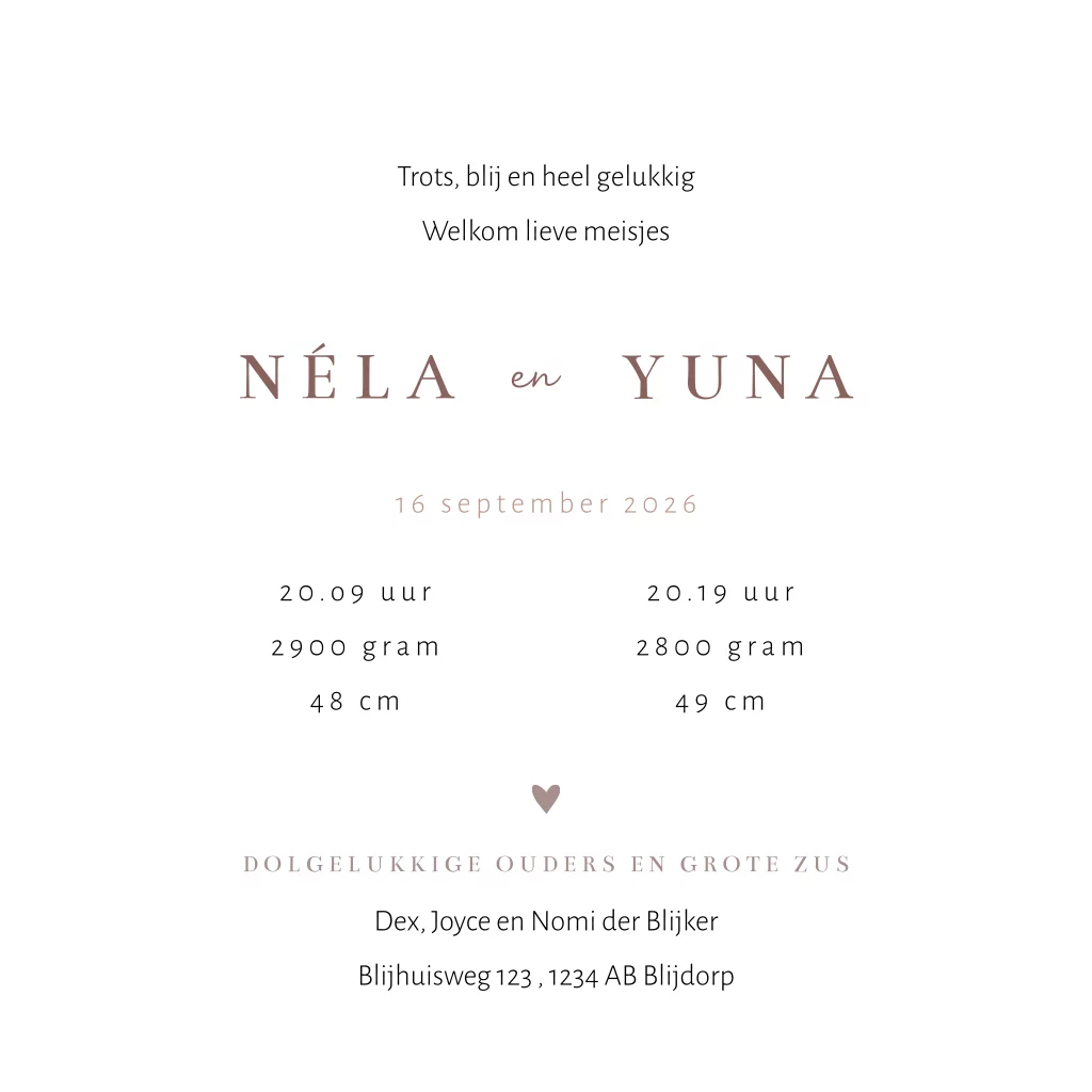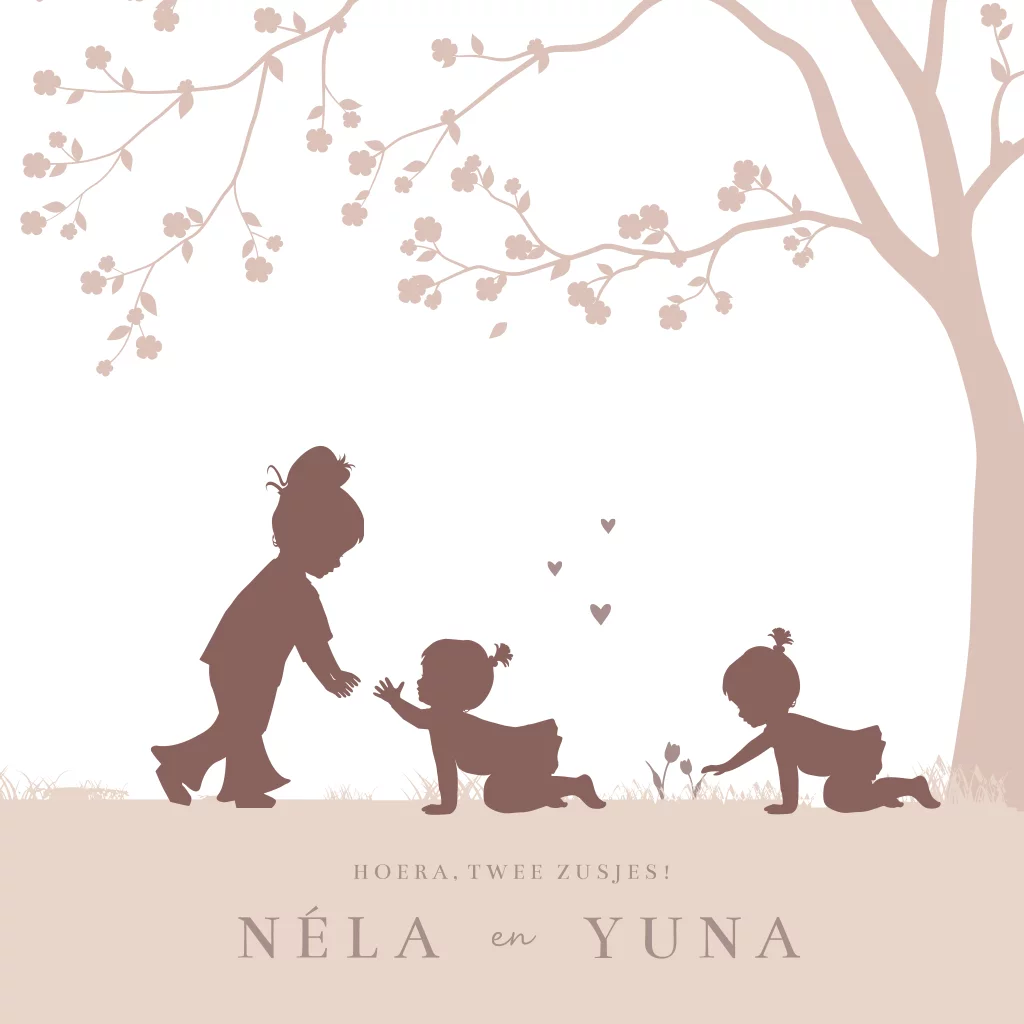 Silhouet geboortekaartje voor een meisjes tweeling met grote zus! Op dit kaartje in trendy roze tinten staan twee kruipende meisjes met hun grote zus onder een boom. Teksten, kleuren en de silhouetten kun je gemakkelijk aanpassen in de editor. Dit silhouet geboortekaartje Nela en Yuna is ook mogelijk voor een andere gezinssamenstelling.