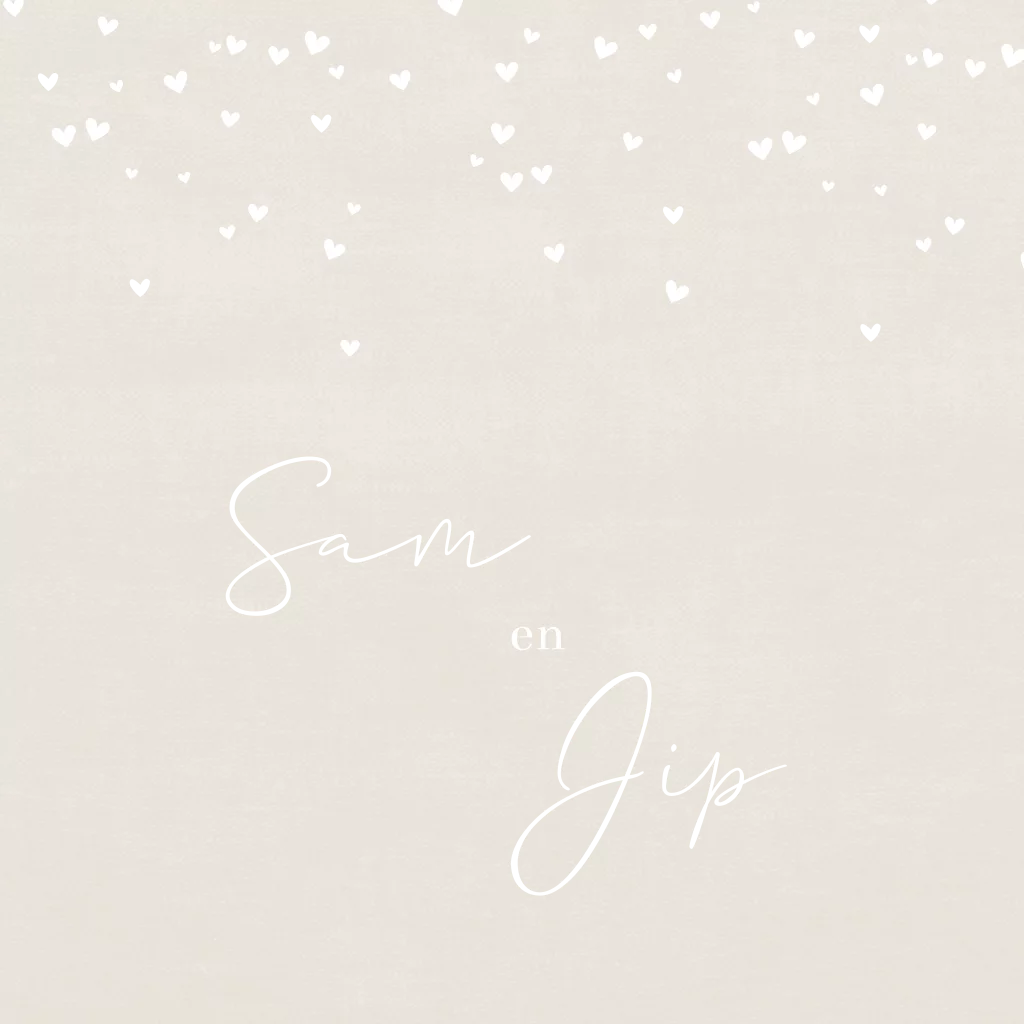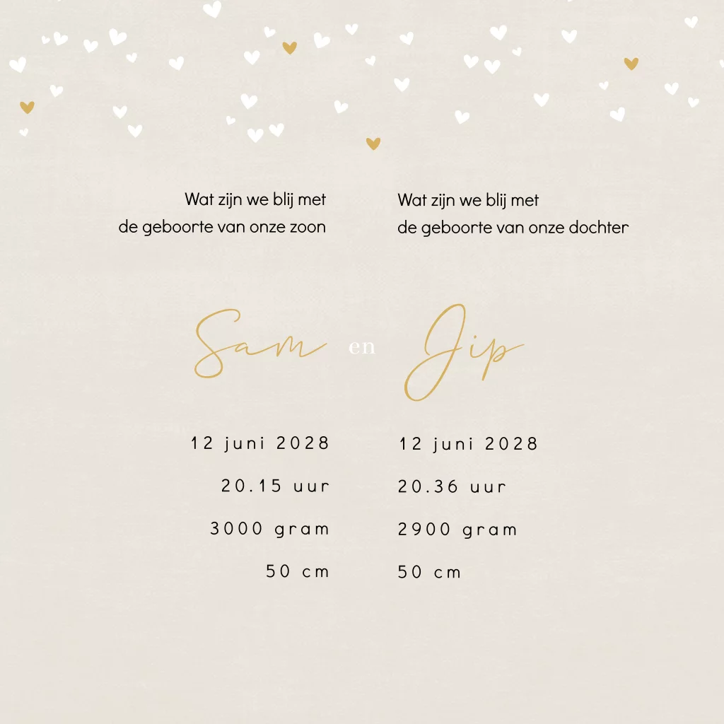 Basic geboortekaartje voor een tweeling. Doordat dit kaartje neutrale tinten heeft is deze voor verschillende samenstellingen geschikt; twee jongens, twee meisjes of een jongen en een meisje. Op dit neutrale unisex tweeling geboortekaartje Sam en Jip een lichte beige achtergrond met een hartjes patroon en hartjes in goudfolie. Dit babykaartje heeft een rustige uitstraling en kun je naar je eigen smaak aanpassen.