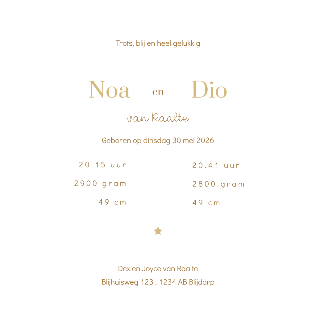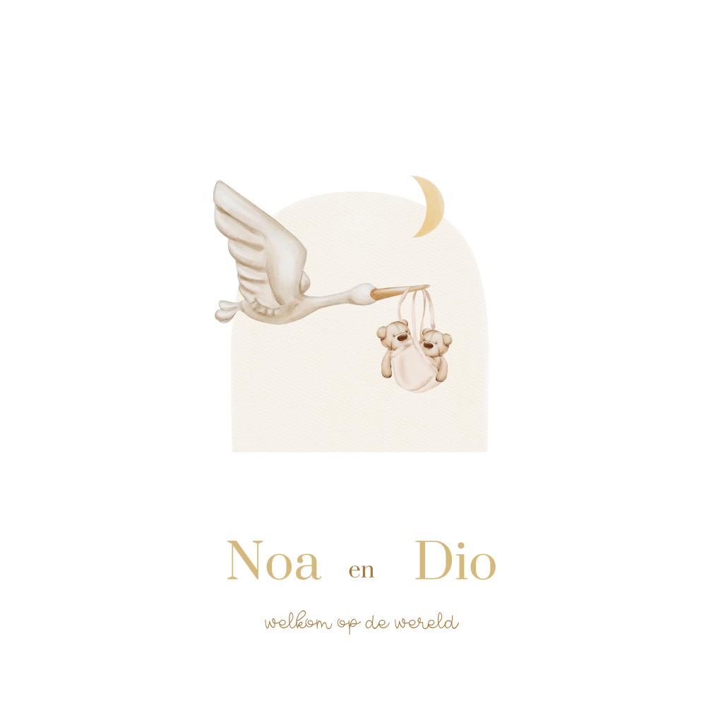 Genderneutraal geboortekaartje voor een tweeling met rustige naturel kleuren. Op dit neutrale babykaartje Noa en Dio een ooievaar met twee teddyberen en op de achtergrond een maantje. Door de nude tinten kun je deze kaart voor alle tweelingen gebruiken, twee jongens, twee meisjes en zelfs voor een jongen en een meisje tweeling. Pas dit kaartje naar je eigen smaak aan in de editor.