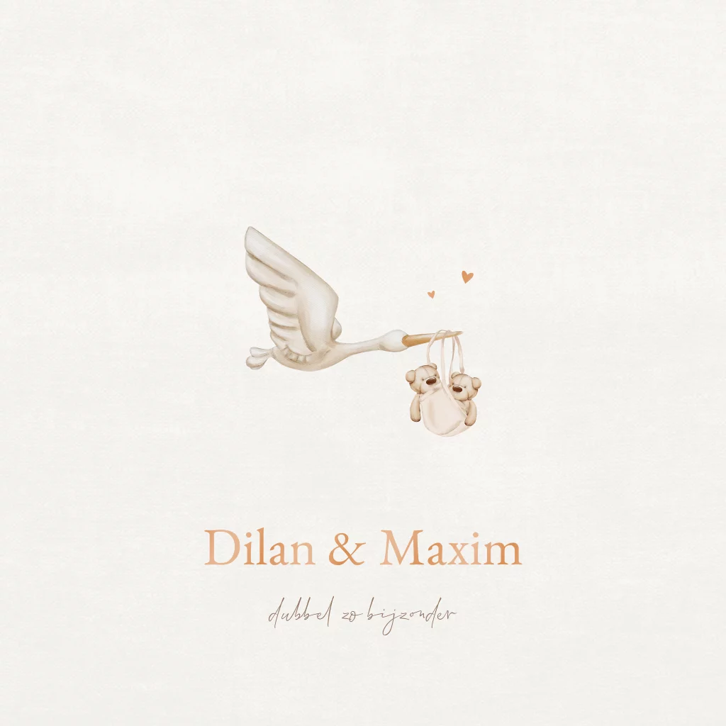 Geboortekaartje voor een tweeling. Dit tweelingkaartje heeft een mooie beige achtergrond met linnenlook. Op deze rustige kaart staat een ooievaar met een doek in zijn bek waarin twee teddy beertjes zitten. Deze schattige beren staan ook op de binnenkant van de kaart. Deze kaart is voorzien van hoogglans bedrukking, maar kan ook worden besteld zonder hoogglans bedrukking.