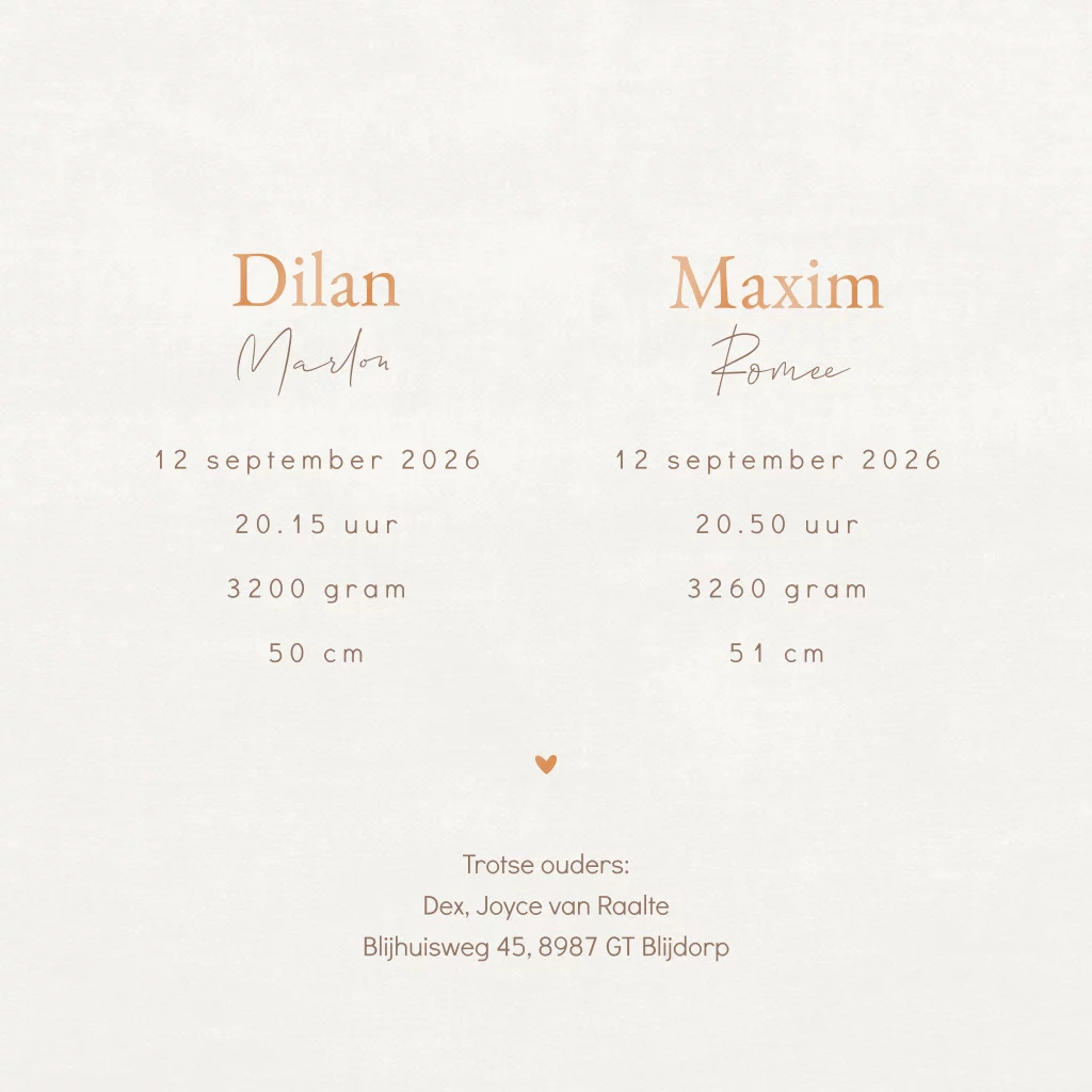 Je kunt dit tweeling geboortekaartje Dilan en Maxim zelf gemakkelijk bewerken, opslaan en bestellen. Deze afbeeldingen vind je terug in het mapje: collectie boho nursery.