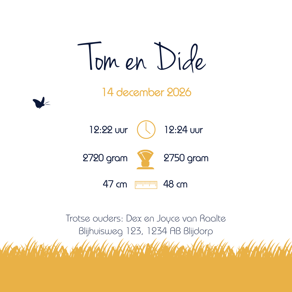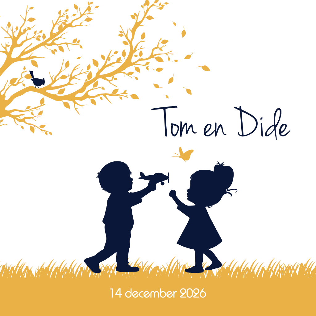 Silhouet geboortekaartje voor een tweeling. Op dit babykaartje zie je een jongen en meisje buiten spelen met een vliegtuigje en vlinder. Samen met het de kleur geel, de boom, vogeltje en het vlindertje is dit een vrolijk kaartje. Dit babykaartje is speciaal voor een jongen en meisje tweeling is aan te passen naar iedere gezinssamenstelling.
