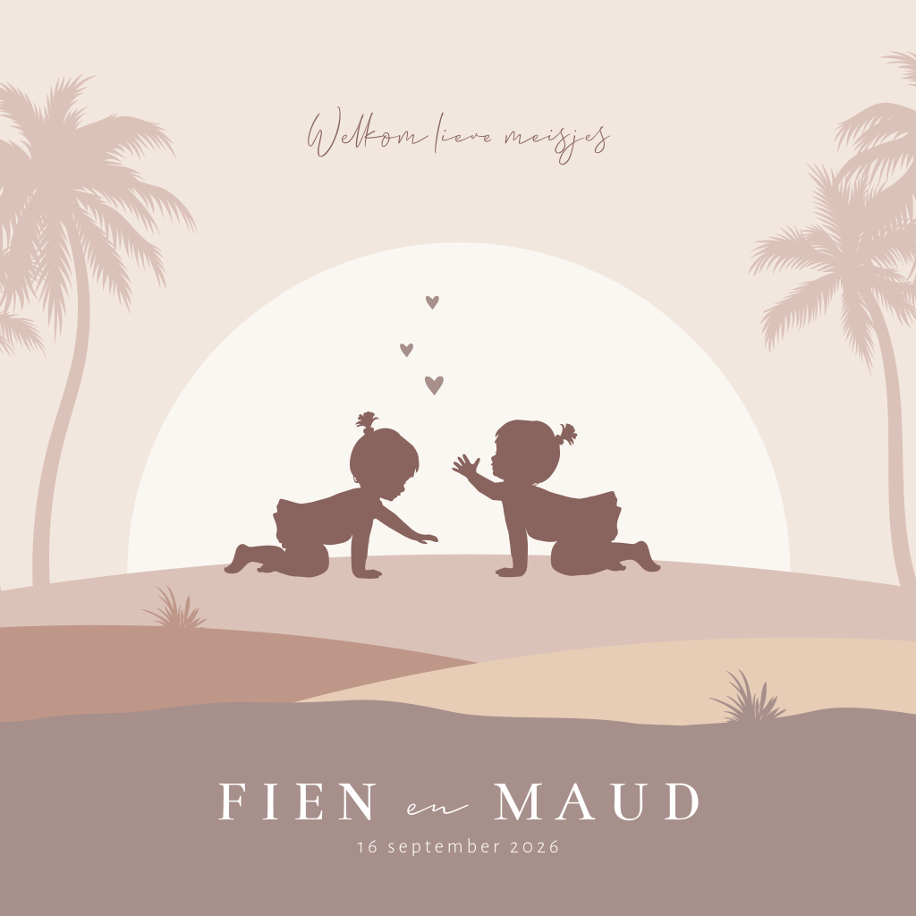 Silhouet geboortekaartje voor een meisjes tweeling! Op dit kaartje in trendy bruine kleuren twee kruipende meisjes voor een ondergaande zon. Verder op dit kaartje palmbomen, een glooiend safari landschap en kleine hartjes. Teksten, kleuren en de silhouetten kun je gemakkelijk aanpassen in de editor. Dit silhouet geboortekaartje Fien en Maud is ook mogelijk voor een andere gezinssamenstelling.