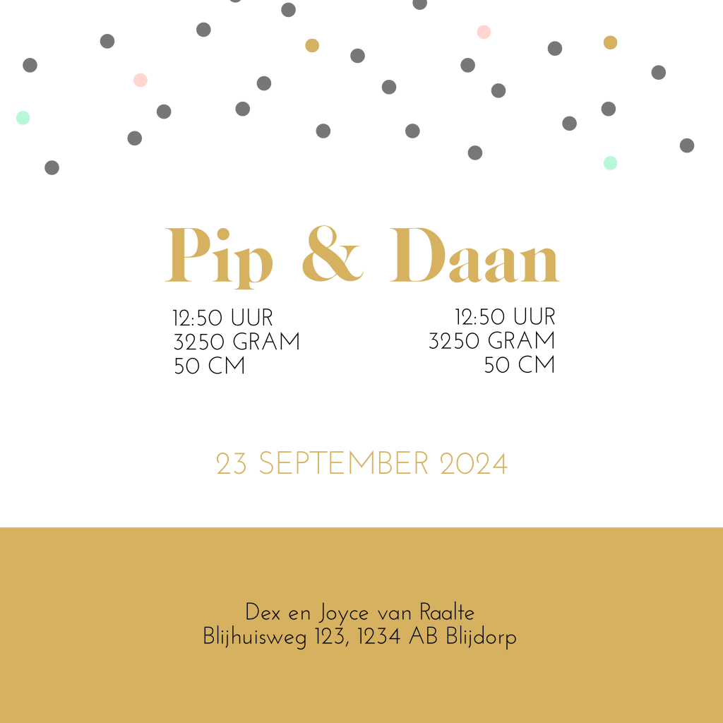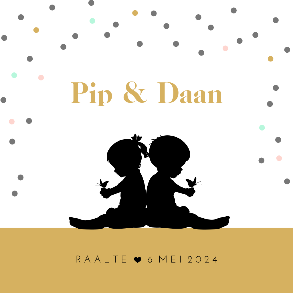 Silhouet geboortekaartje voor een tweeling. Op het kaartje zitten een broertje en zusje met de rug tegen elkaar aan met een vlindertje op de hand. De vrolijk gekleurde stippen op de achtergrond maken dit kaartje compleet.