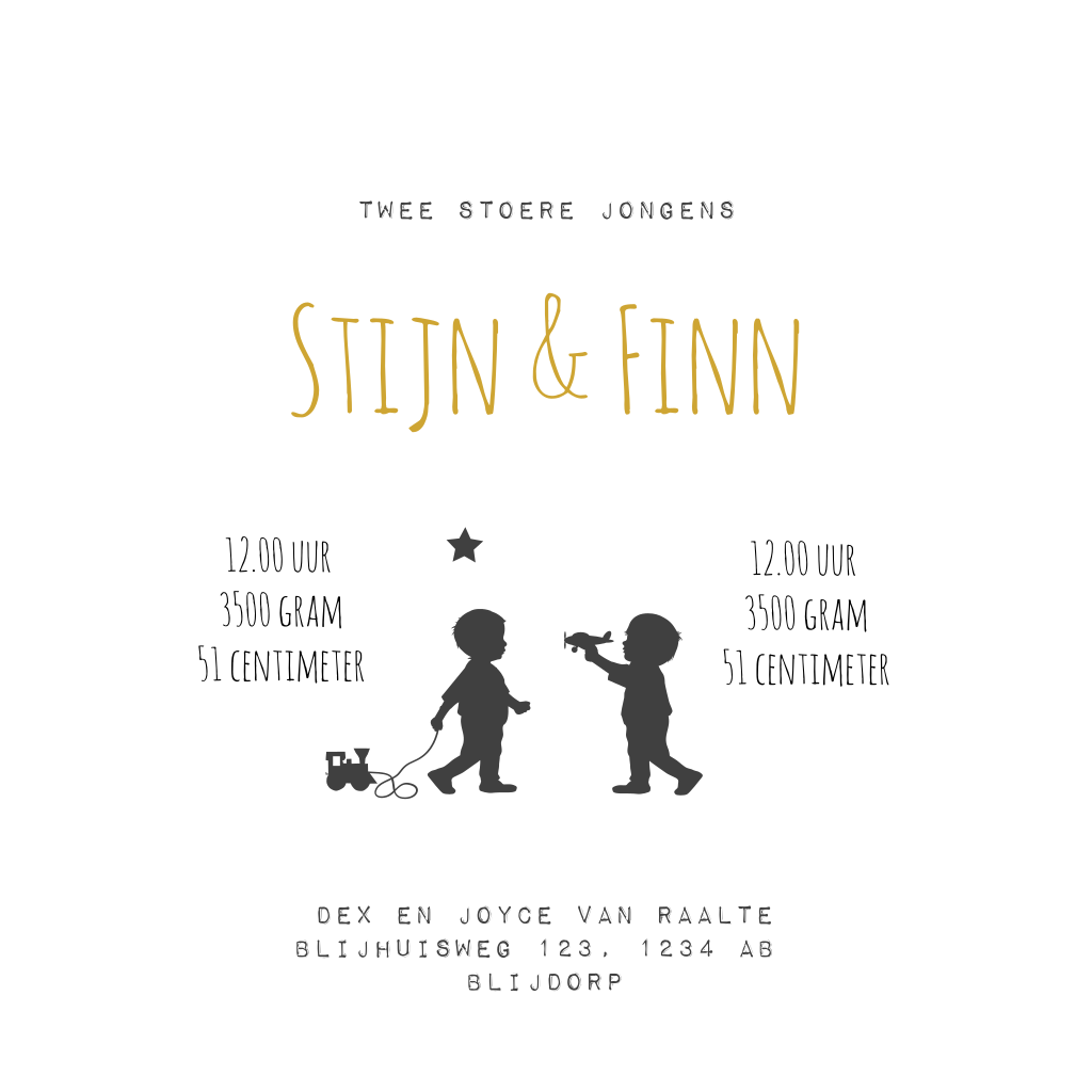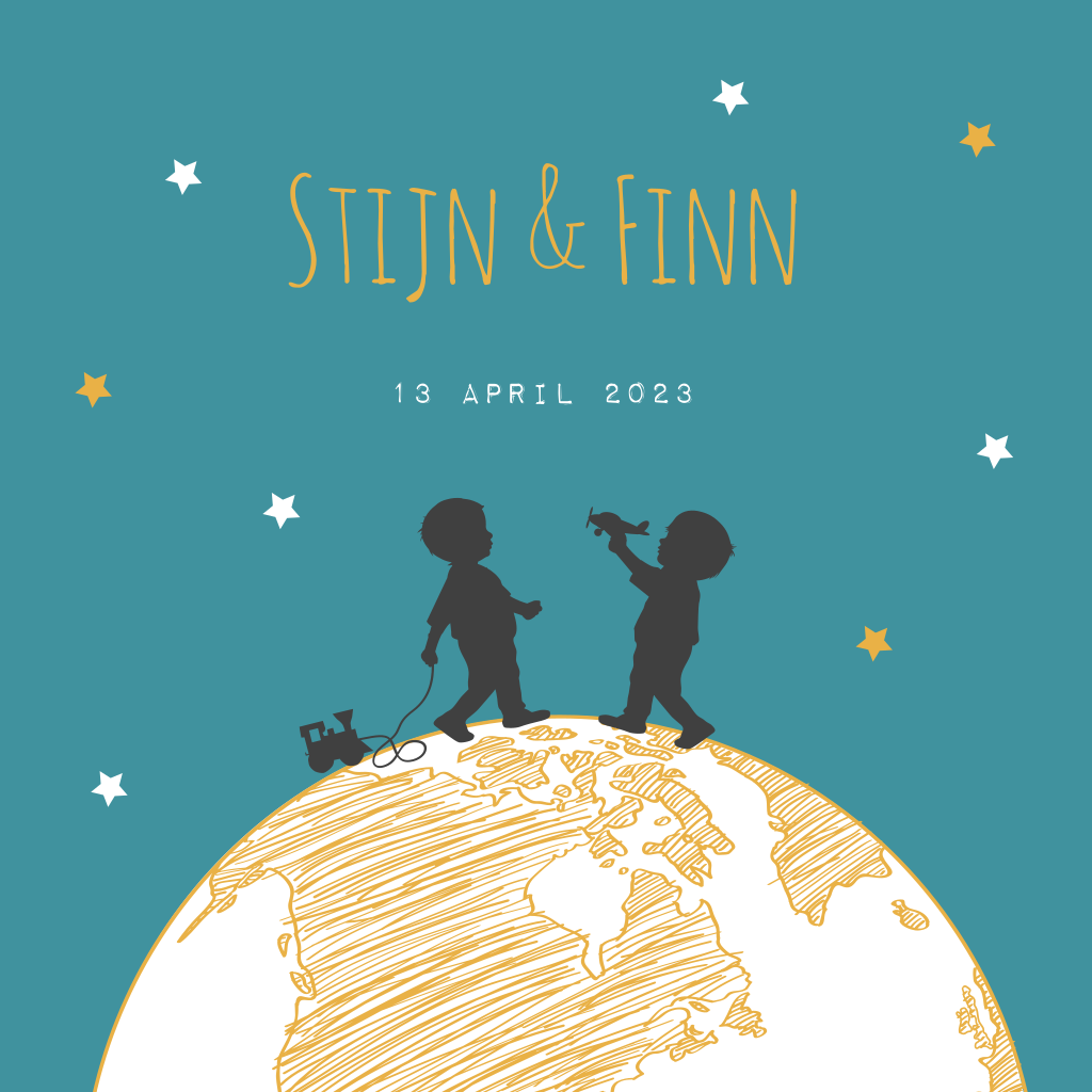Trendy geboortekaartje voor een jongens tweeling. Op deze kaart staan silhouetten van 2 spelende baby broertjes op een wereldbol met sterretjes op de achtergrond. Een stoere kleurencombinatie van petrol blauw en oker geel. Zowel de kleuren als de silhouetten zijn aan te passen naar jullie eigen wensen.