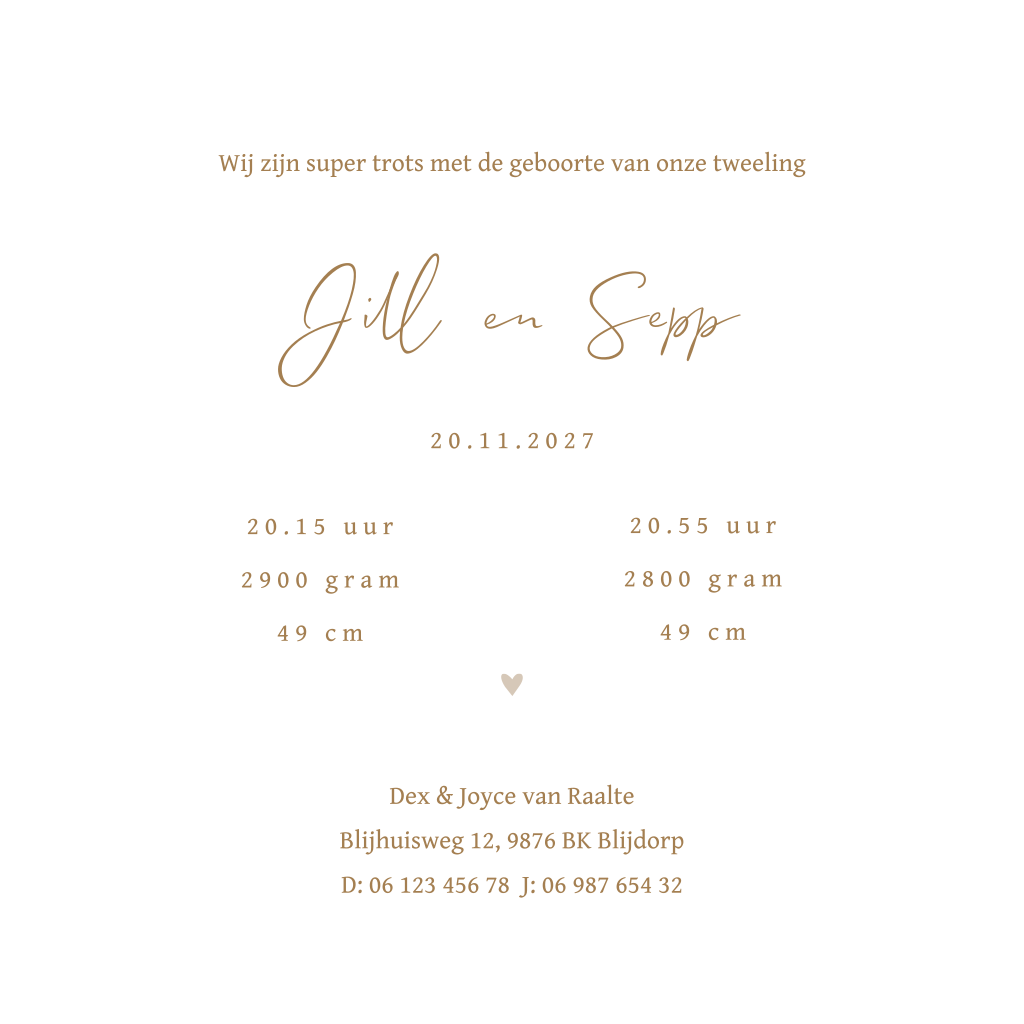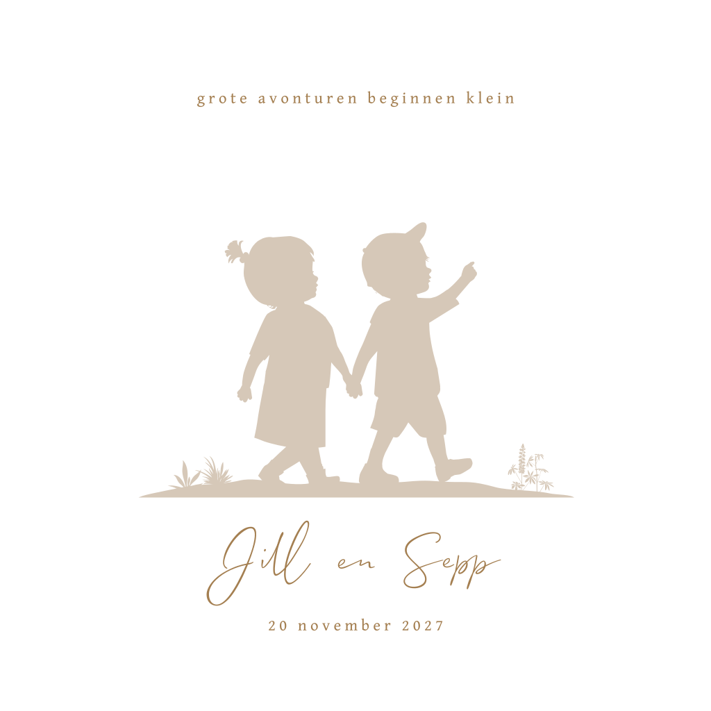 Een silhouet geboortekaartje voor een twee-eiige tweeling, in dit geval een jongen en een meisje. Op dit kaartje Jill en Sepp een silhouet van een jongen en een meisje hand in hand. Door de zachte beige naturel tinten is dit kaartje te gebruiken voor twee tweeling jongens of tweeling meisjes. Pas de lettertypes en kleuren naar je eigen smaak aan de editor. Ook mogelijk in een andere gezinssamenstelling. Hulp nodig? Laat het ons weten!